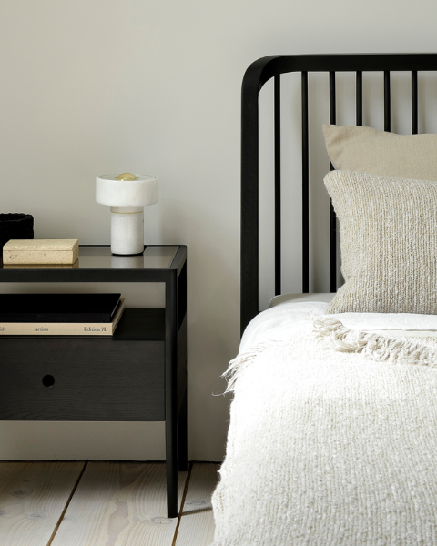 The Eastvold Mora is an heirloom-quality dresser handcrafted in Minnesota. It makes for stunning and functional storage, and the rounded corners bring a sense of liveliness. Add the Cleo side table to help balance the materials in your bedroom. Made by skilled craftspeople in California from upcycled materials.