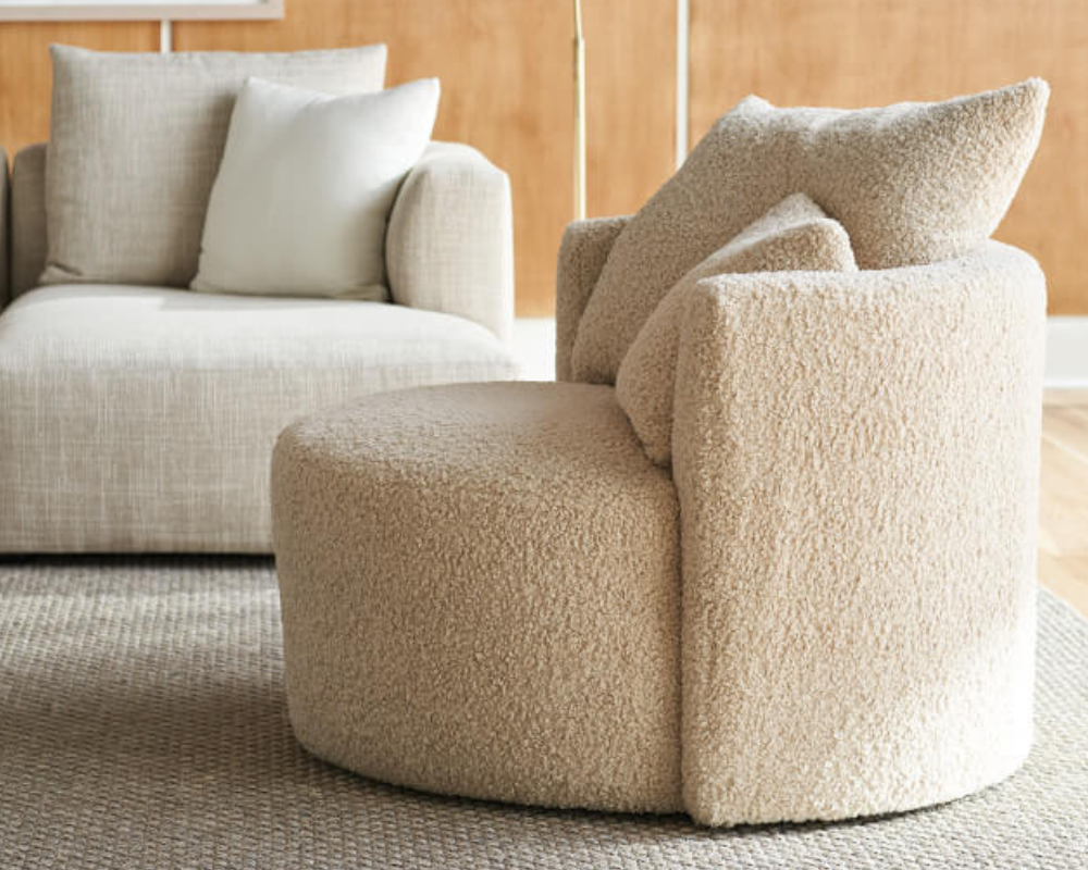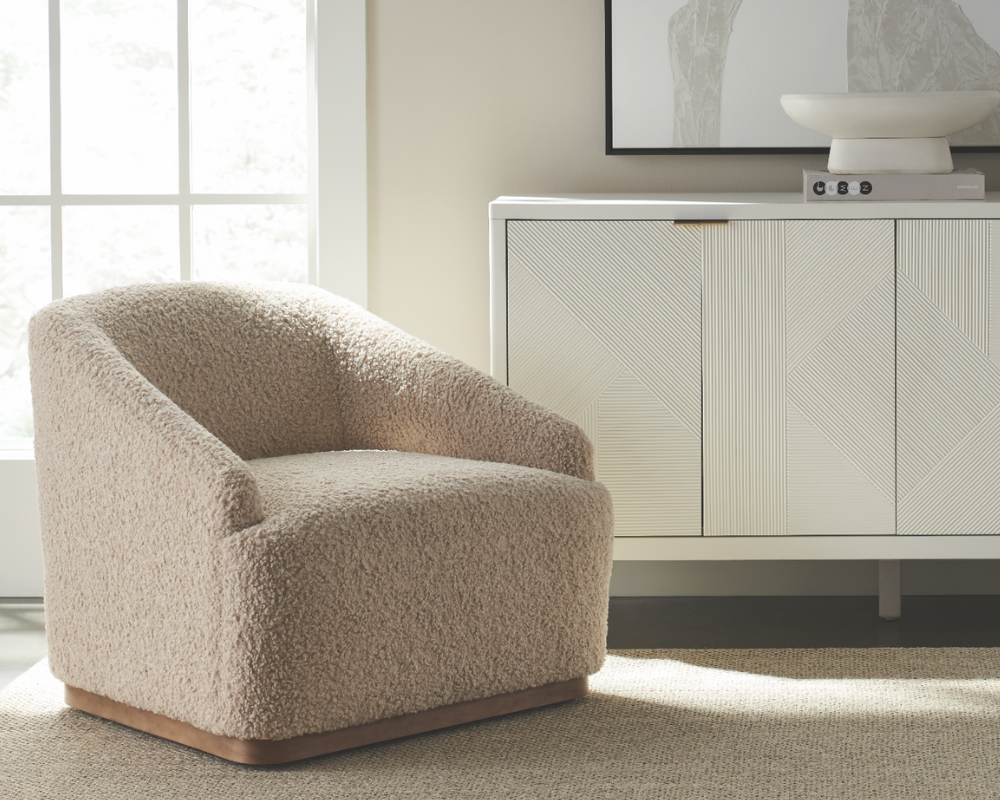If you’re looking for an accent chair that can really hold its own in larger spaces, the Leander Swivel from Rowe may be the choice for you. The epitome of design that’s inspired by the organic shapes of nature, this plushly rounded chair with its two plump back pillows is everything you need for a cozy sink-in experience.