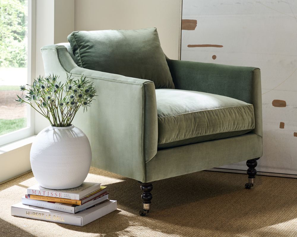 This iconic accent chair is part of the bestselling Madeline collection from Rowe, and beloved for its contemporary take on a vintage-inspired aesthetic. With an option to add casters, as well as a matching ottoman, there are so many ways this beautiful chair can bring a unique flair to your home spaces. Try it in antiqued moss velvet upholstery, and your Madeline accent chair will be available for Quick Ship too!