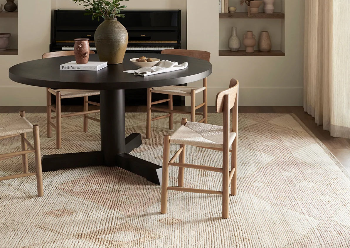 In your dining room, look for rugs that extend at least two feet beyond the table so there’s room for when you’re pulling out chairs. And in your bedroom, look for rugs that are two to three feet wider than your bed, to have enough space for stepping into and out of bed.