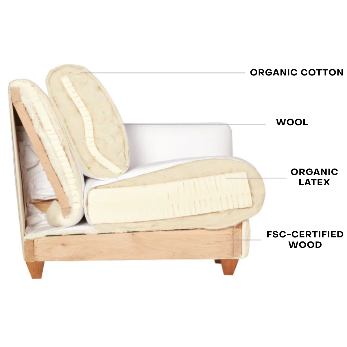 - The Cushions: Any Inside Green cushioning will be made from a combination of 100% organic cotton, humanely harvested EcoWool, and organic latex, which is naturally hypoallergenic, mold resistant, and biodegradable. Natural jute and hemp replace metal springs for the seating support to give a more durable, long lasting, and comfortable experience.