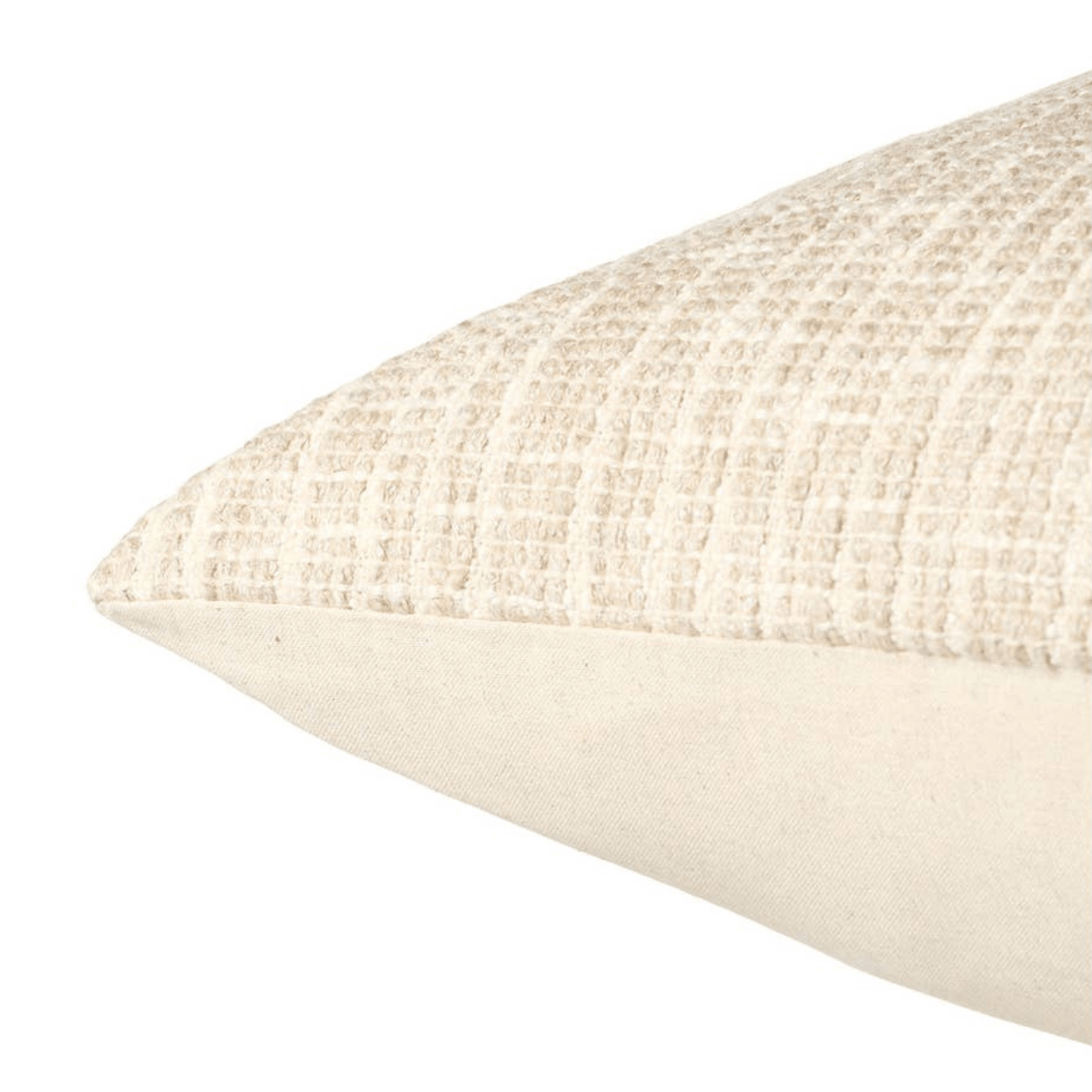 The handcrafted Cueva throw pillow delights with a striped plaid design in hues of cream and beige. The neutral tones establish a versatile accent piece that works in any indoor space.