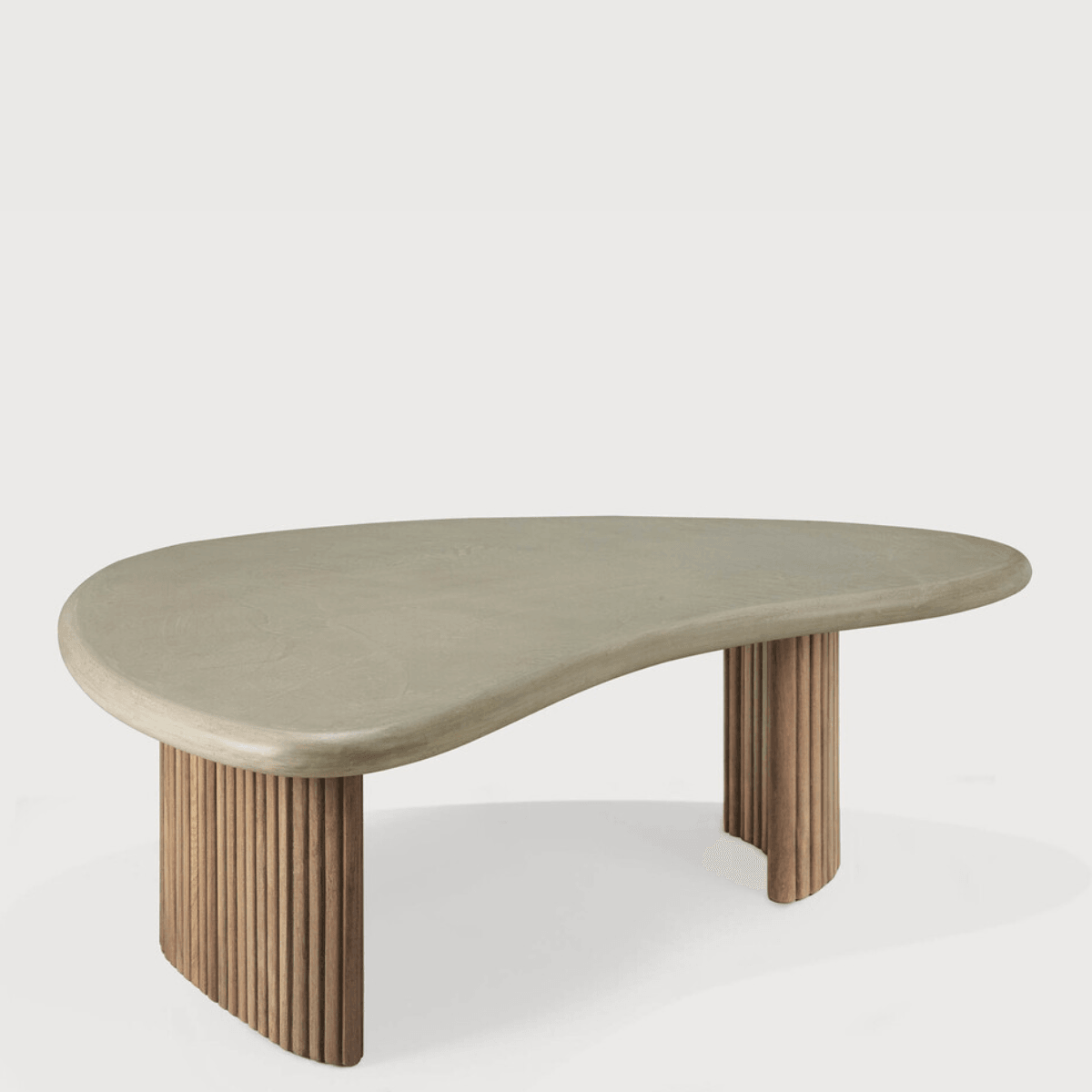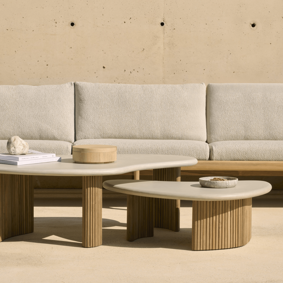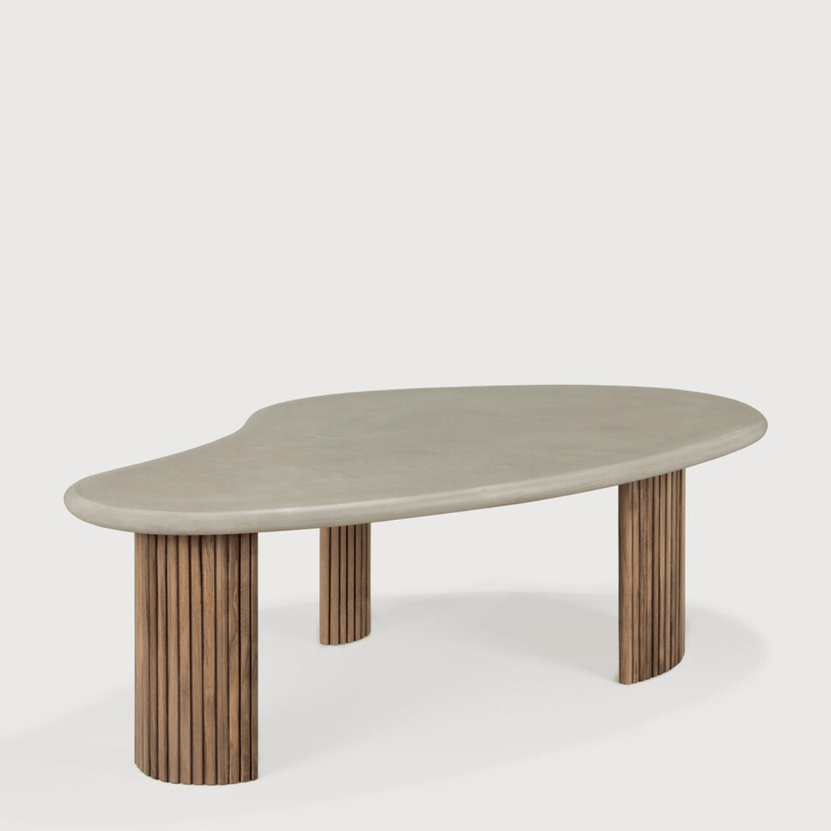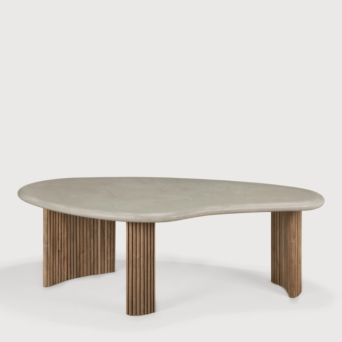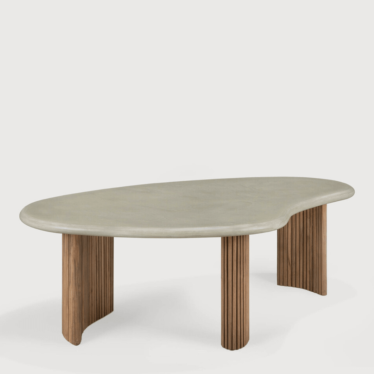 Playful, pebble shapes set on a beautiful, folded, base. Inspired by its popular indoor design, the Boomerang outdoor coffee table features a hand-finished concrete top, paired with a reclaimed solid teak base, a beautiful material mix provides durable practicality to both indoor and outdoor spaces. Configured with the two sizes together, or as a stand-alone, this well-proportioned design is sure to capture attention.
