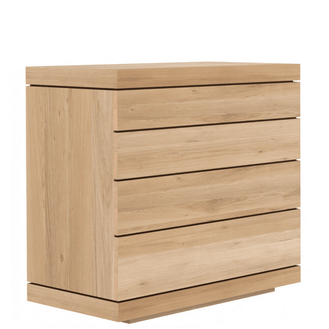 Cascading natural wood patterns, a robust construction and ample storage space are the highlights of the Burger chest of drawers.