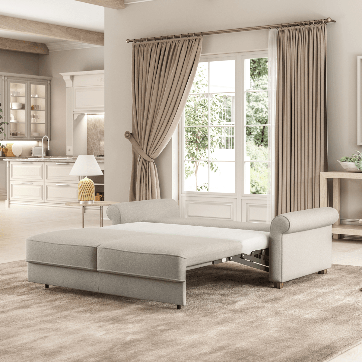 Every day sleeping and sitting are made easy with Casey. The traditional rolled arm with welting matches any room. Choose between a King, Queen, Full XL, and Cot bed sizes; offering more versatility for all needs in a room. Sit and sleep in confidence.