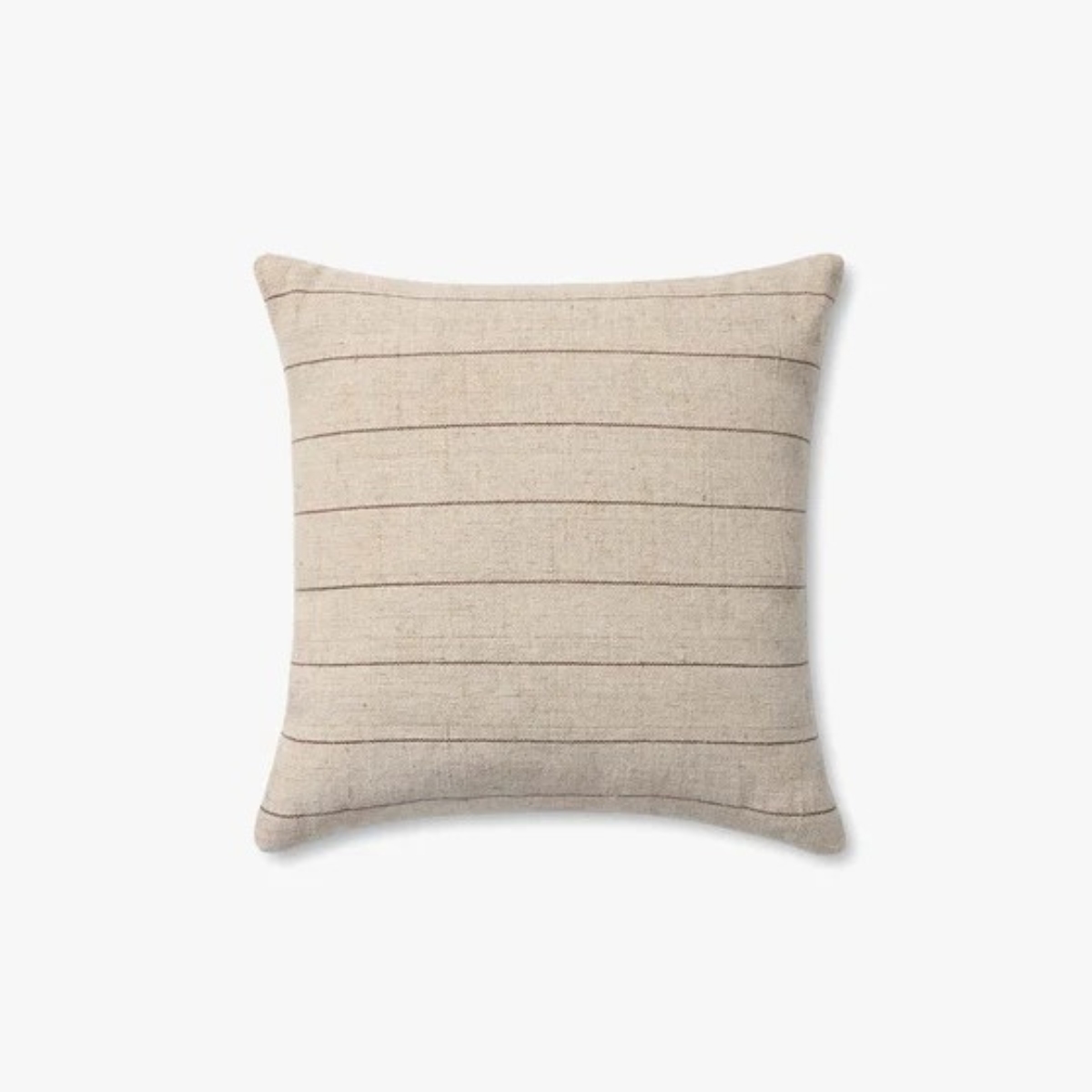 Keisha is a striped throw pillow from Amber Lewis x Loloi with a heathered beige and brown color palette, a versatile design for a range of home decor styles, from traditional to organic modern. The pillow cover is woven of jute and cotton in India and measures 18" x 18", a versatile size for living rooms and bedrooms.