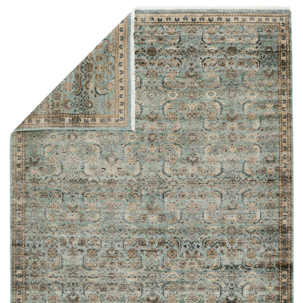 Whimsical colorways combine with the opulent detail of a traditional-inspired pattern; the Someplace in Time collection represents nostalgia and progression, heritage and the contemporary. The Chantay rug's cool blue, green, golden tan, and black details ground spaces with luxe appeal and an exceptional hand-knotted quality. Crafted of handspun wool, this artisan-made rug boasts an authentic, timeworn look.