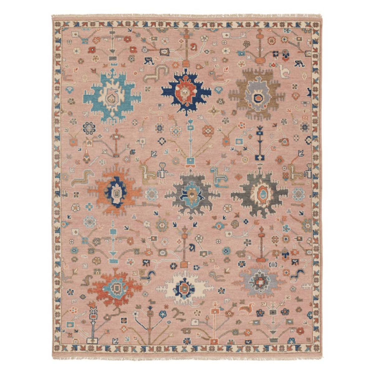 The updated traditional Everly collection features Oushak-inspired designs in whimsical color palettes. The Matera design features a sweet colorway of pink, yellow, navy, cream, peach, and taupe. This hand-knotted wool rug anchors living spaces with a fresh take on vintage style. The low, easy-care pile delights in both high and low traffic areas of the home.