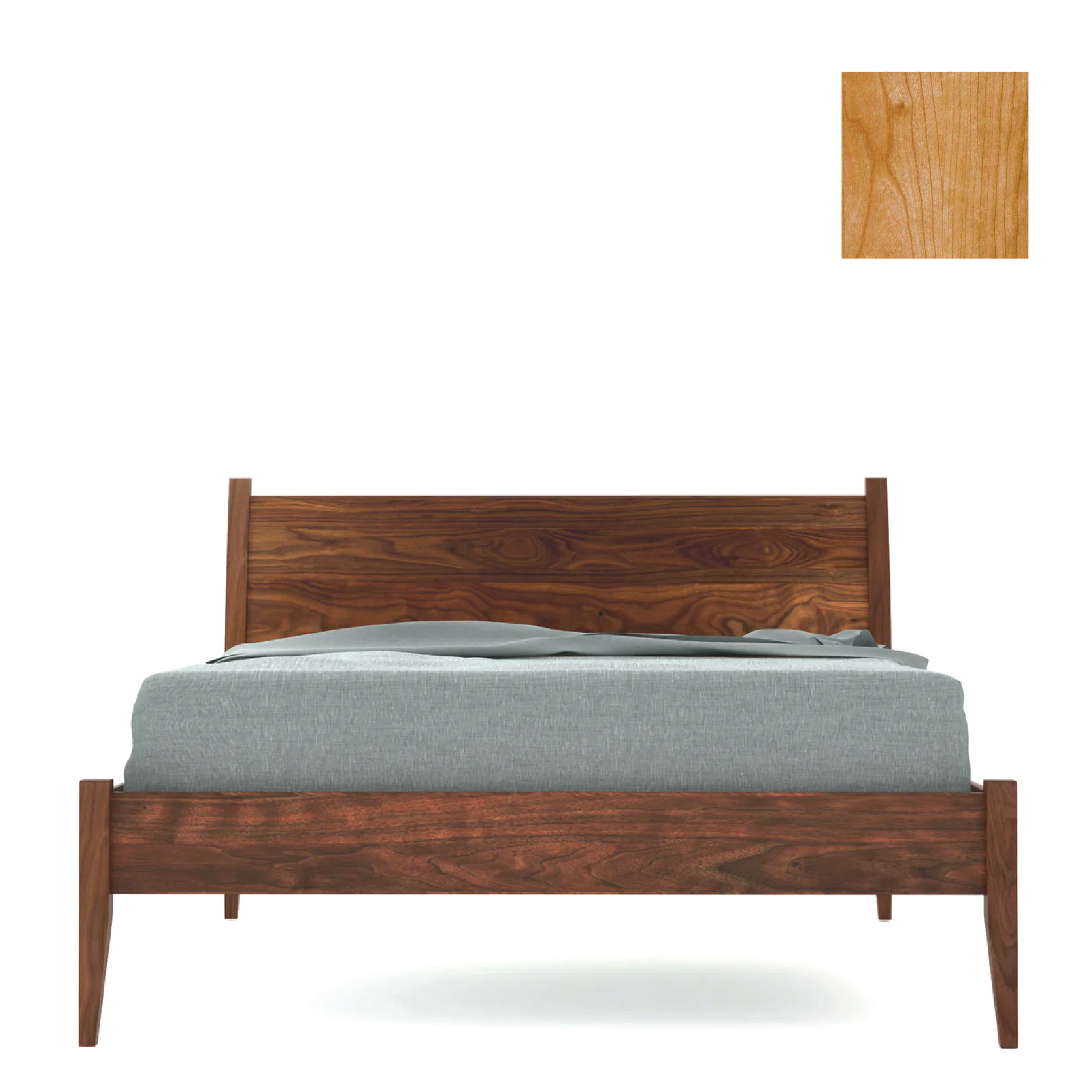 The Harmony Bed offers a slanted headboard with gently sloping and curved bedposts, offering a comfortable sitting positing for reading in bed. The low footboard of this bed allows the mattress to sit above the three sides of the exposed bed frame.