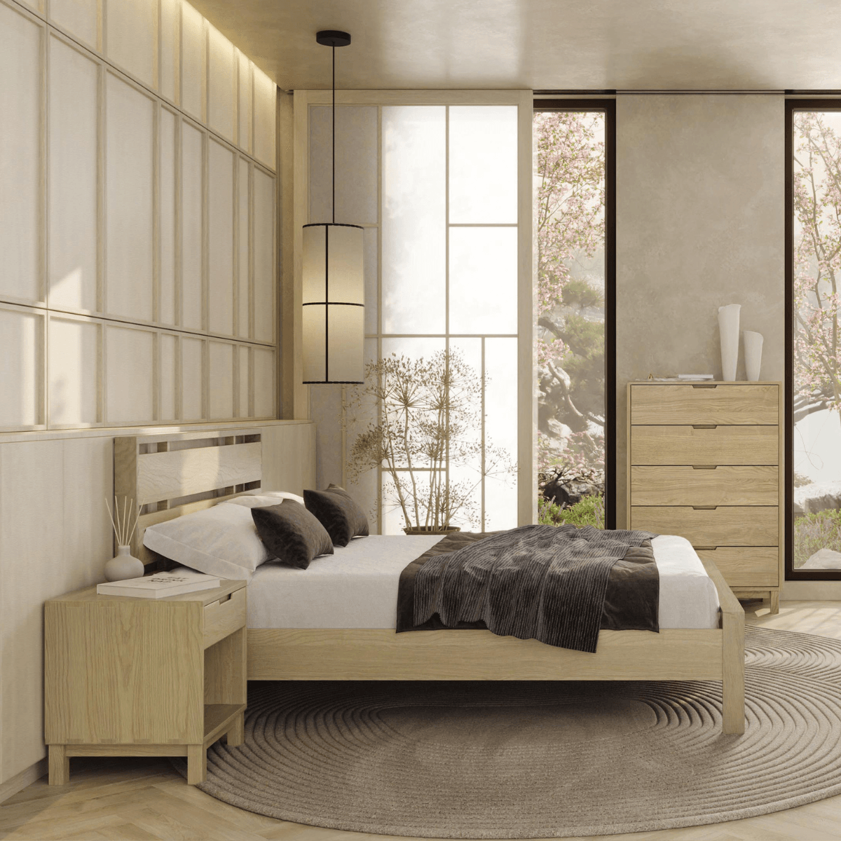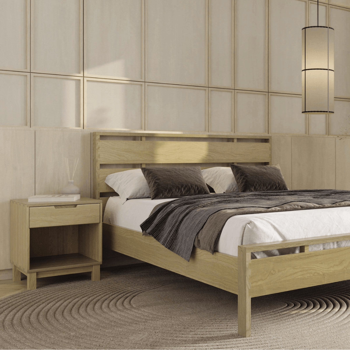 A confluence of contemporary design and traditional woodworking techniques, the Oslo bedroom proudly declares its craftsmanship with visible joinery throughout. The Oslo Bed is designed for a mattress only. It is perfectly complemented by the attached nightstands.