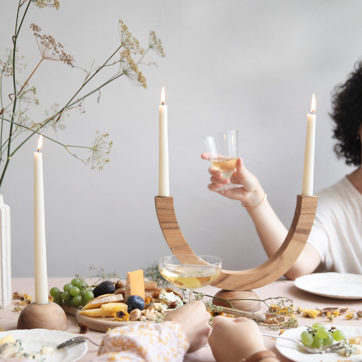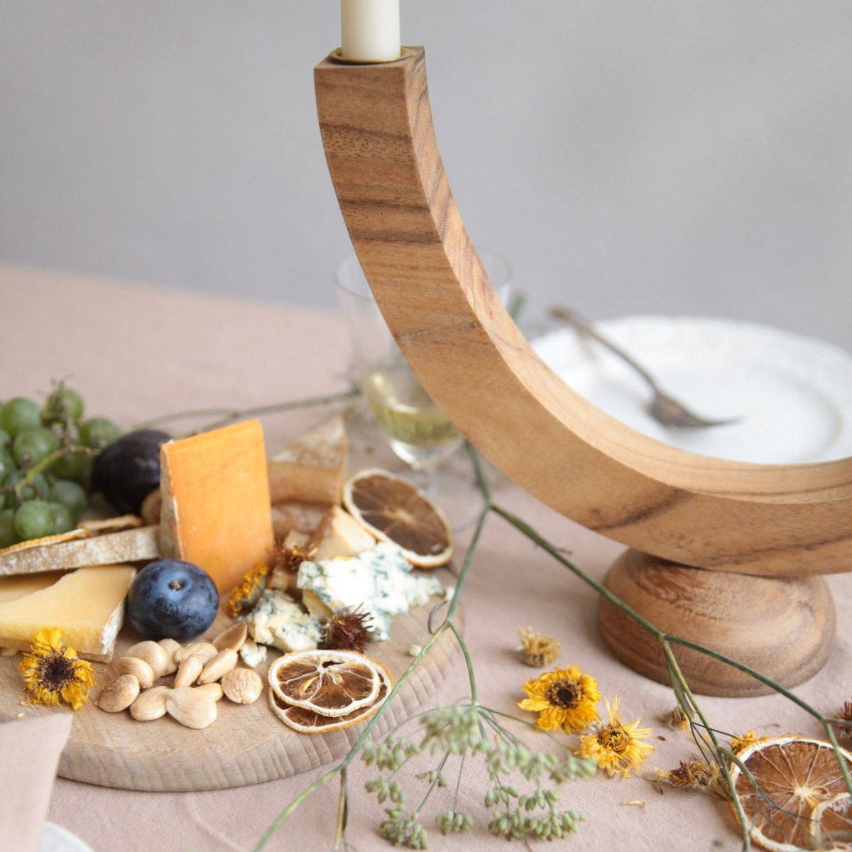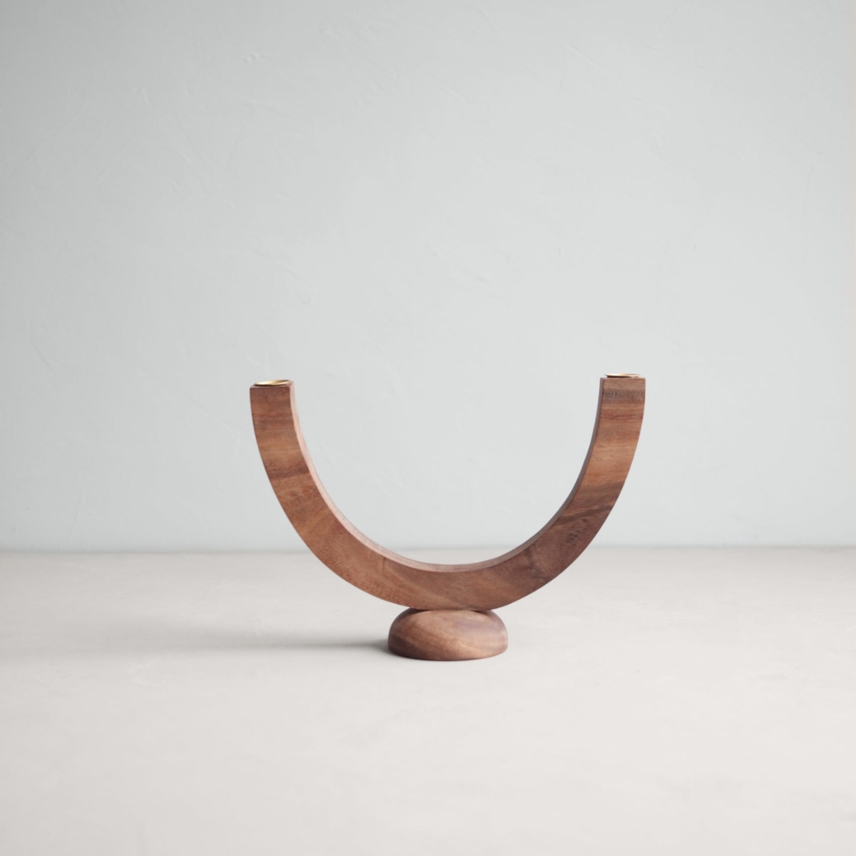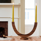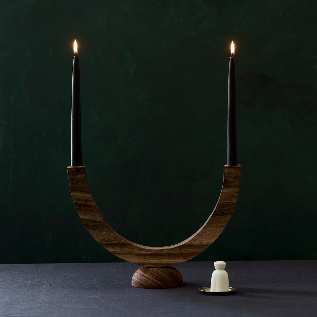 This hand-finished wooden candelabra is inspired by the changing phases and warm glow of the moon. A sculpted crescent of sustainably sourced walnut balances on a smooth, domed base. Two solid brass candle cups each fit a standard taper. Revive as needed with mineral oil and a clean, dry cloth.