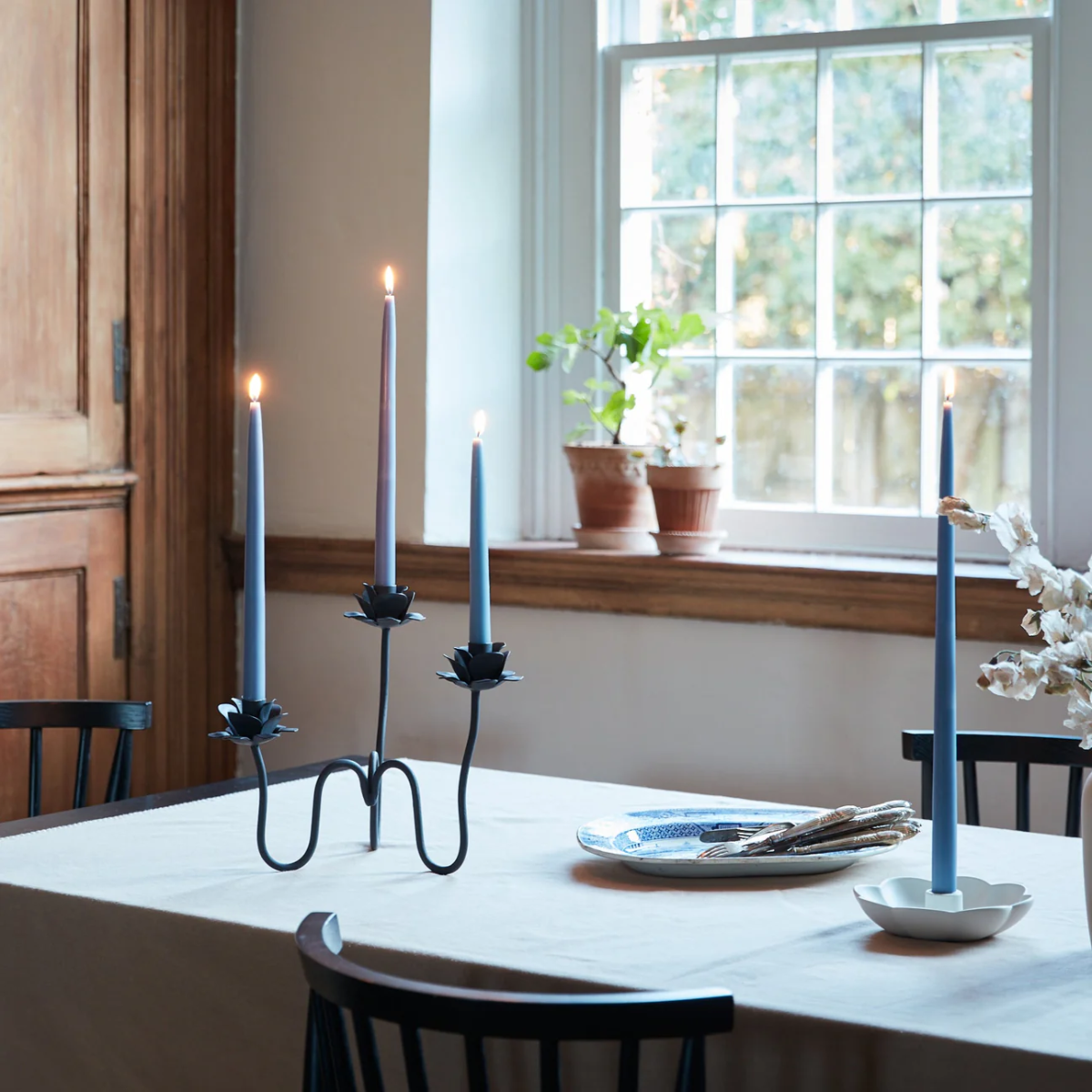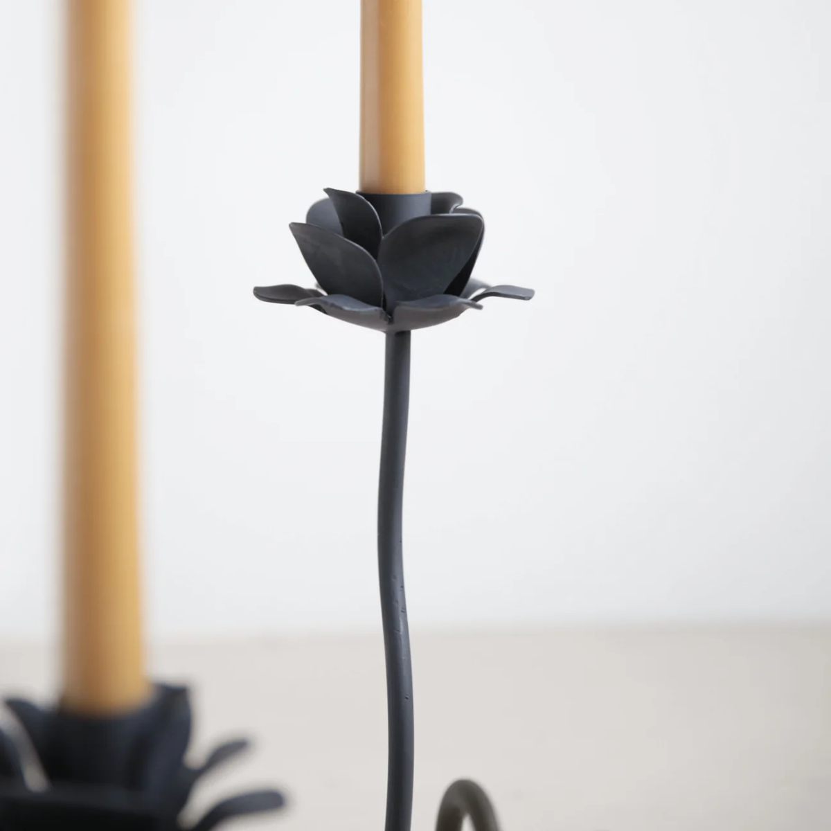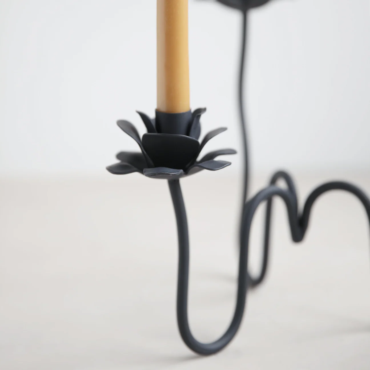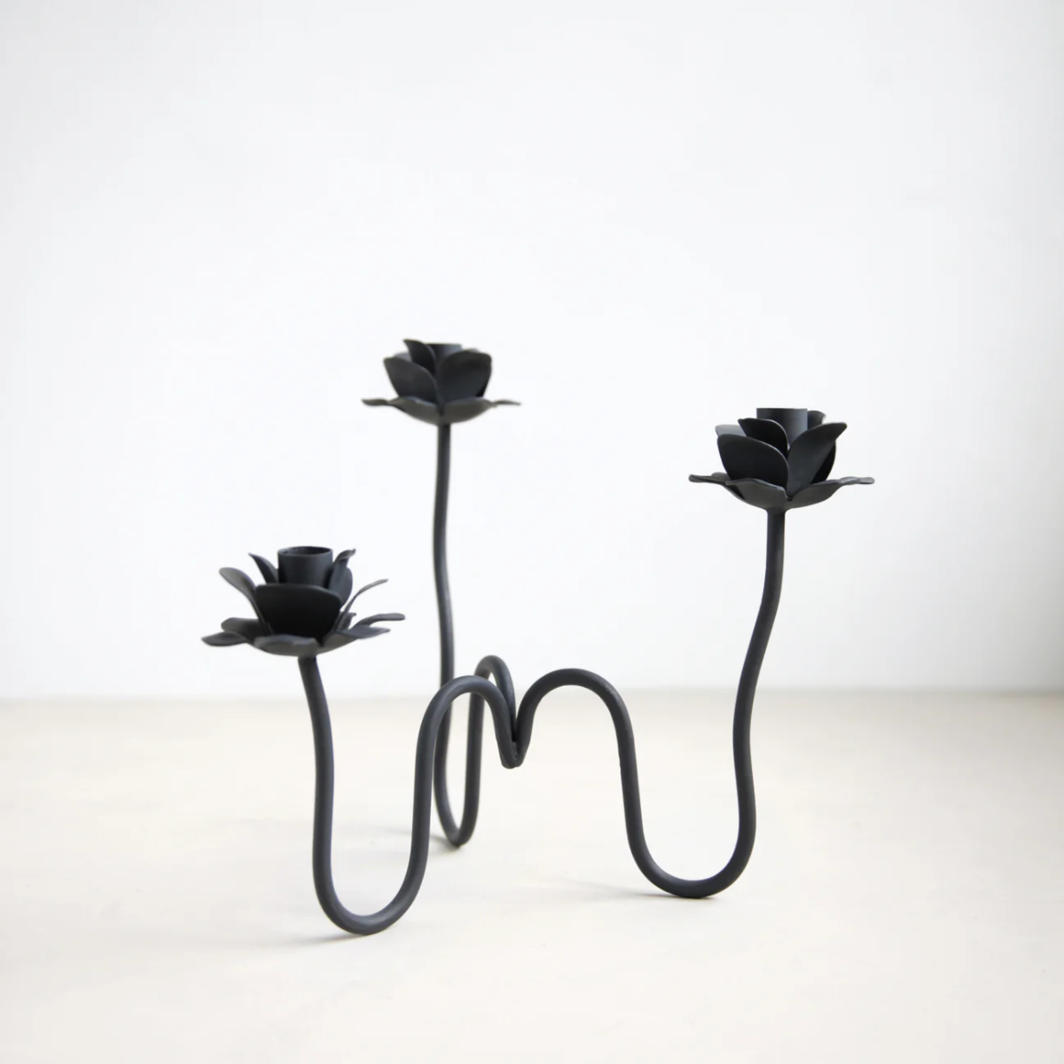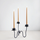 The Rana Candelabra evokes curving stems of ranunculus flowers bending in a garden. Hand-forged from solid iron, each winding stem holds a standard taper candle, casting a warm glow wherever it’s placed. Translating to “glittering” and “mesmerizing” in Persian, Arabic, Turkish, and Kurdish, rana is an invitation to commune with the beauty of fluttering petals and flickering candlelight. Wipe clean with a soft cloth.