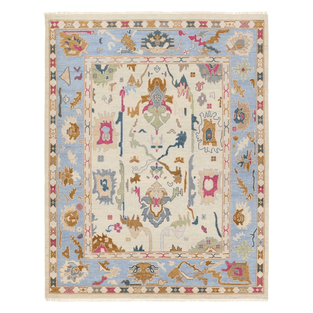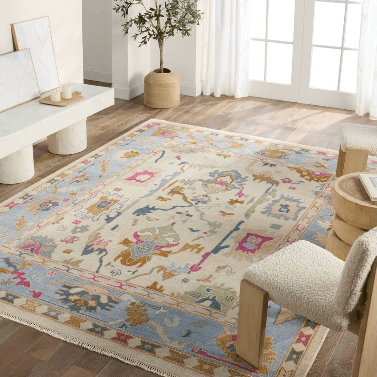 The updated traditional Everly collection features Oushak-inspired designs in tones soft pastel. The Luni design features a fun colorway of blue, gold, magenta, tan, green, and cream. This hand-knotted wool rug anchors living spaces with a fresh take on vintage style. The low, easy-care pile delights in both high and low traffic areas of the home.