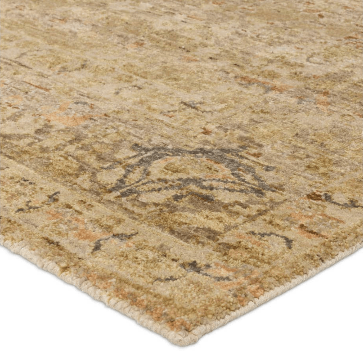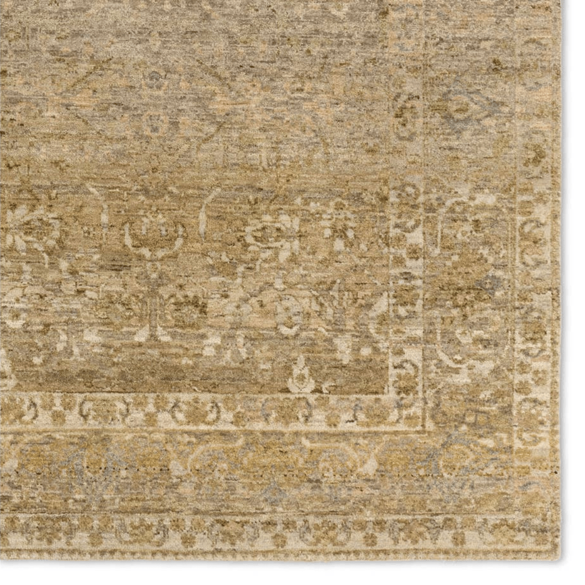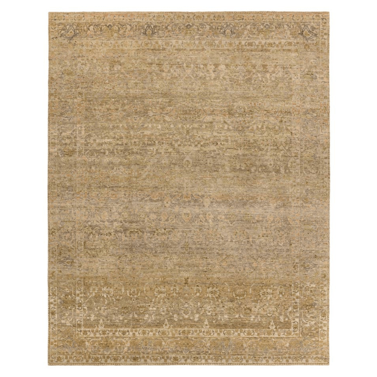 The handknotted Mihret collection gathers inspiration from traditional patterns that offer elegance and a refined, modern colorway. Expertly handcrafted in India with 64 knots per square inch for unparalleled quality, the Elira design features traditional floral and scrolling details and a thick border. The green, tan, gray, and cream colorway, and intentional distressing establishes an updated traditional style. Naturally stain-resistant, the 100% cut wool pile is easy to care for and withstands high traffic areas of the home, children, and pets. Obtaining both a Nest Seal and RugMark certification, this global area rug brings ethical, handmade luxury to the home.