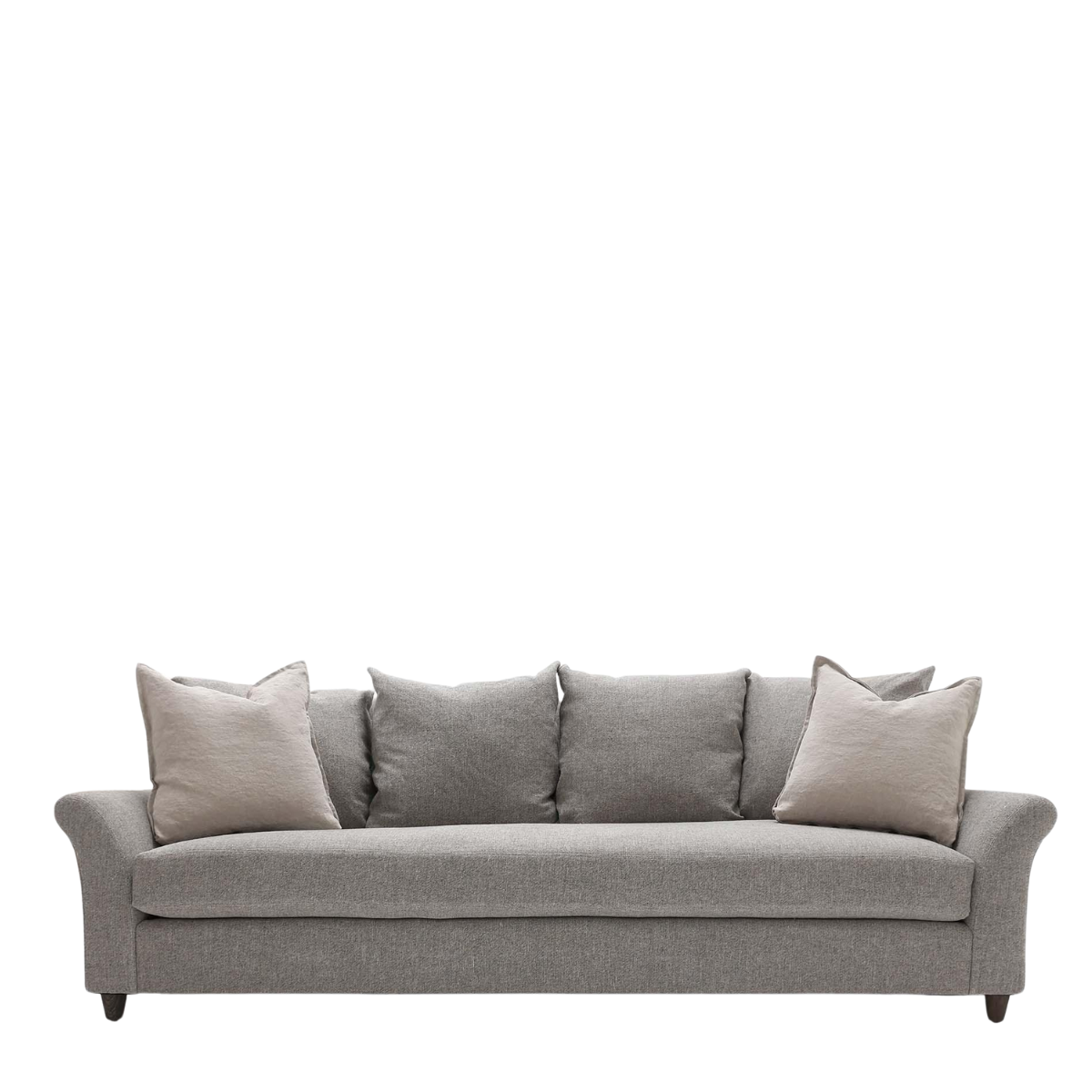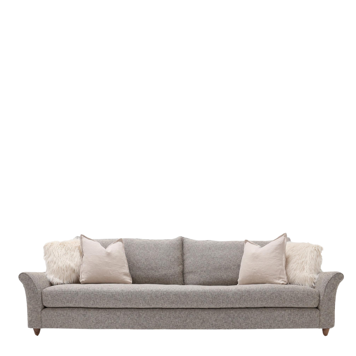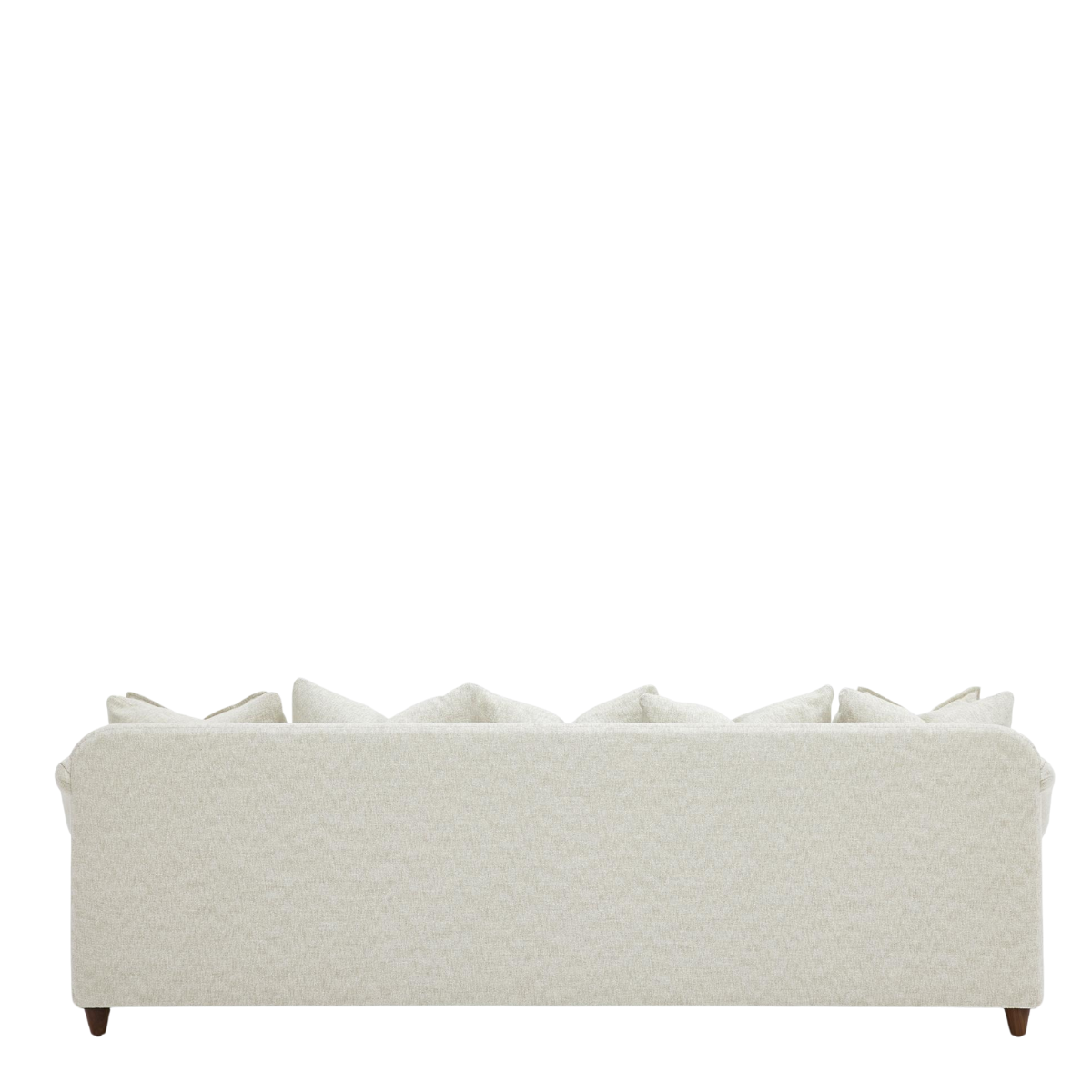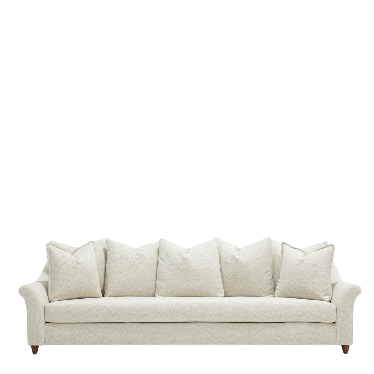 The Camille sofa line showcases a series of graceful curves for a sleek, sculptural look, complemented by modern wood legs for an added touch of elegance.