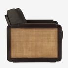 • Made from dark brown tainted teak with a varnish finish. Features rattan detailing in Roasted colorway, and 100% linen cushion covers over high-density foam.