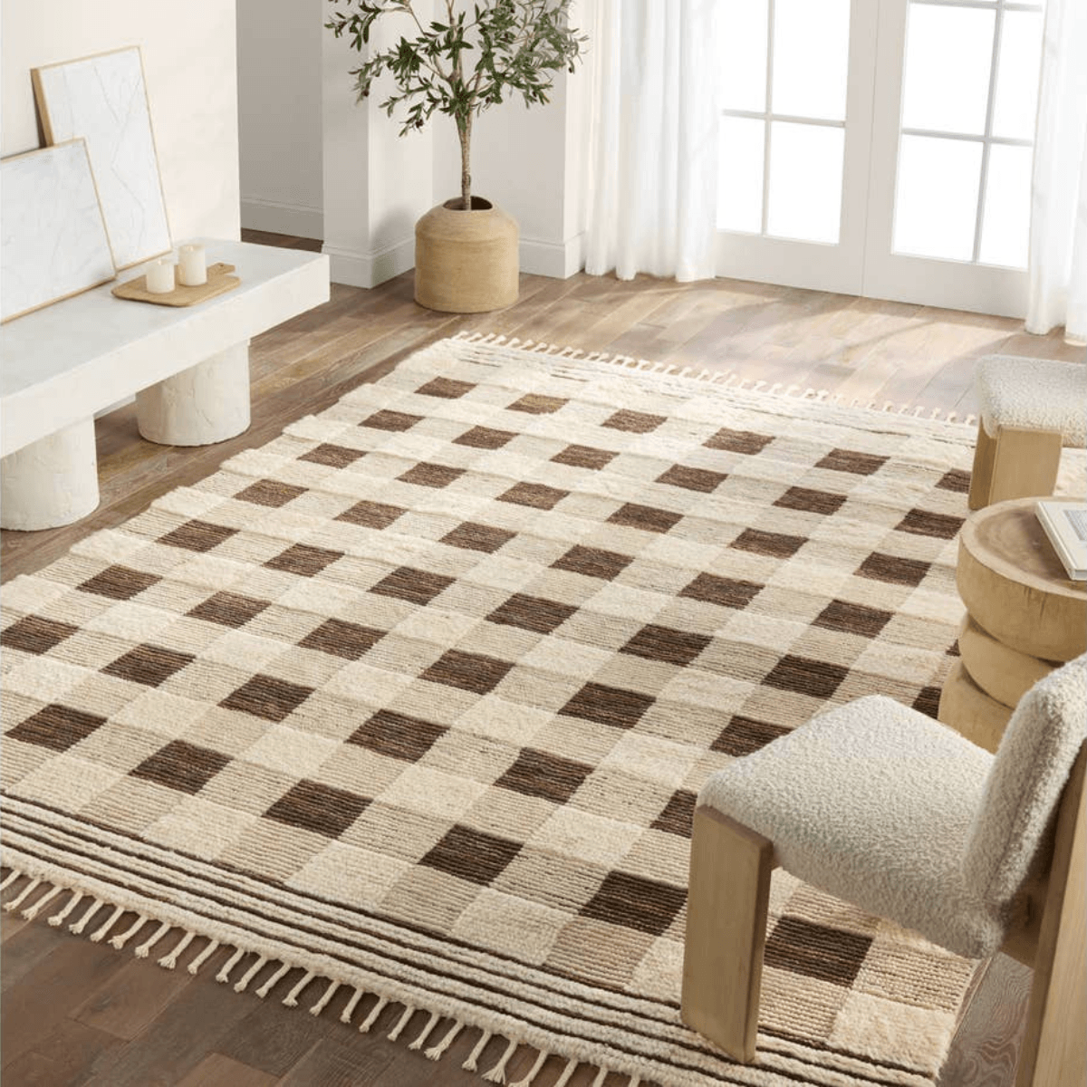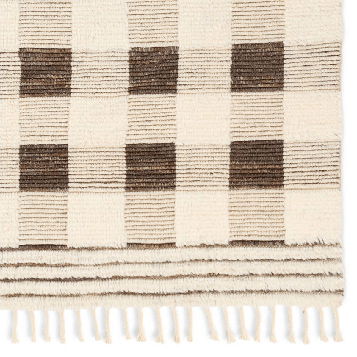 The Desouk collection melds modern allure with the global vibes of Morocco. The Berkshire hand-knotted rug showcases a geometric grid pattern with contrasting brown, cream, and tan tones. This handcrafted rug boasts plush, cut wool pile that pairs beautifully with braided tassel details. Perfect for adding warmth to cozy bedrooms and sitting areas, this inviting accent complements a range of decor and styles.