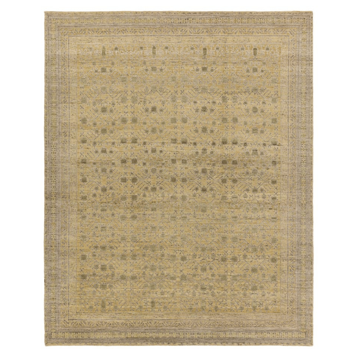 The handknotted Mihret collection gathers inspiration from traditional patterns that offer elegance and a refined, modern colorway. Expertly handcrafted in India with 64 knots per square inch for unparalleled quality, the Delacor design features traditional trellis and geometric details and a thick border. The green, gray, cream, and taupe colorway, and intentional distressing establishes an updated traditional style. Naturally stain-resistant, the 100% cut wool pile is easy to care for and withstands high traffic areas of the home, children, and pets. Obtaining both a Nest Seal and RugMark certification, this global area rug brings ethical, handmade luxury to the home.