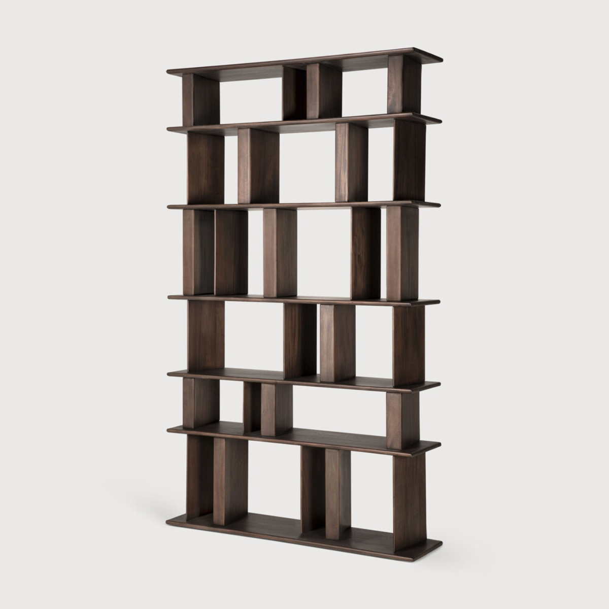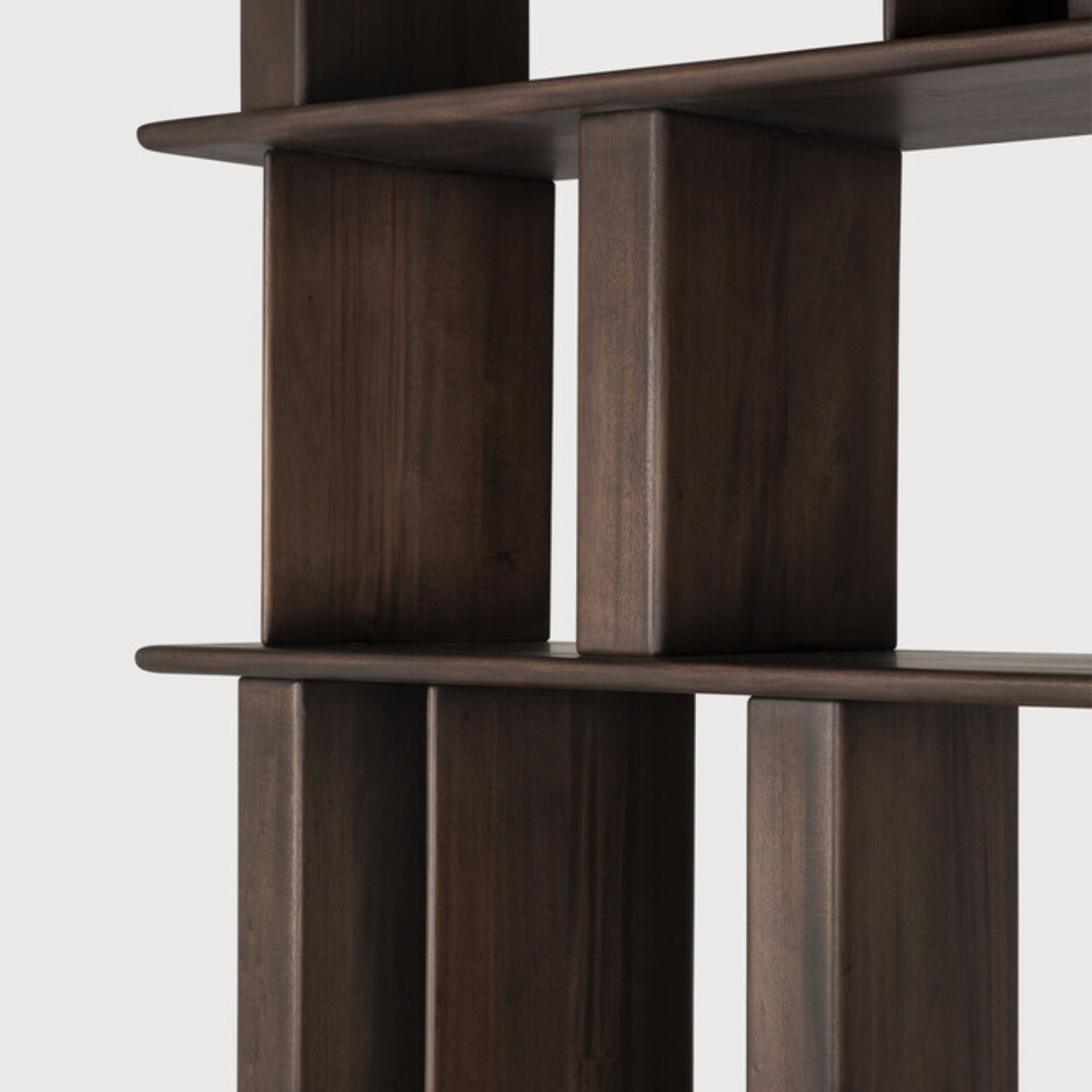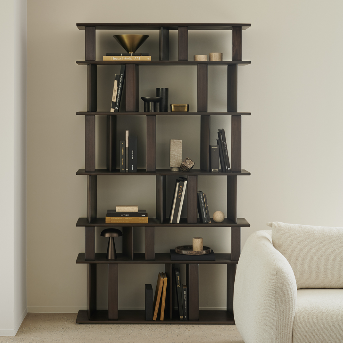 A rhythmic play of form and function, the Block rack brings sculptural impact to everyday storage. Crafted from solid mahogany, its angular dividers offer dynamic views from every angle—whether placed solo or in sequence. Defined by its clean lines and open spacing, the Block rack balances visual interest with everyday practicality.