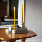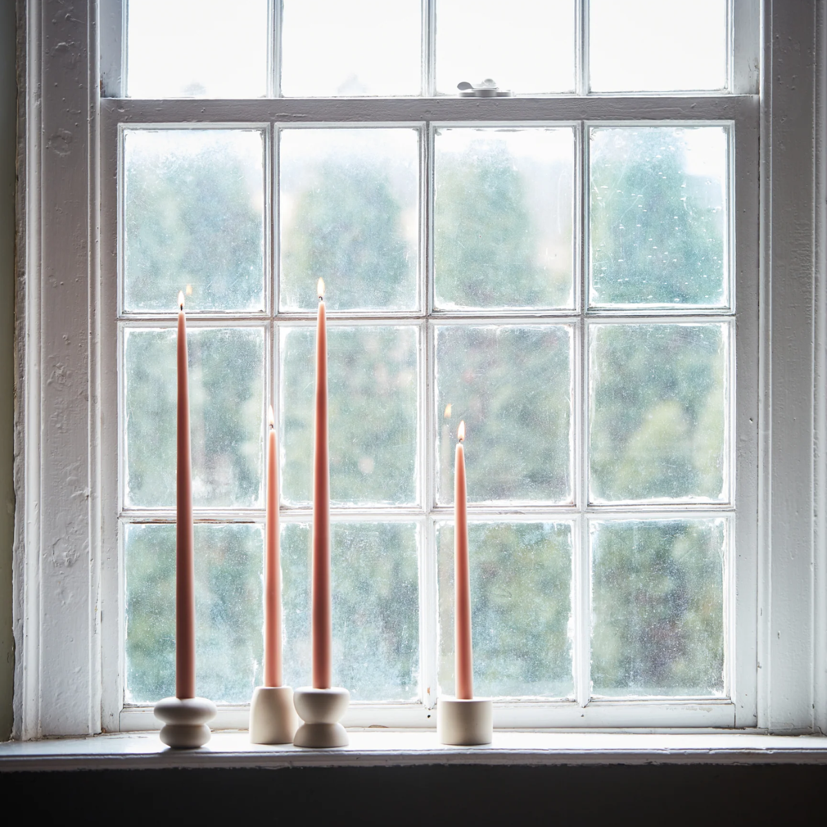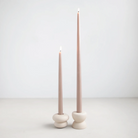 The petite ceramic taper holders complement our taper candles with their matte finish and modern form-a bold collection perfect for everyday use or entertaining. Each holder is sized to fit a standard taper candle.