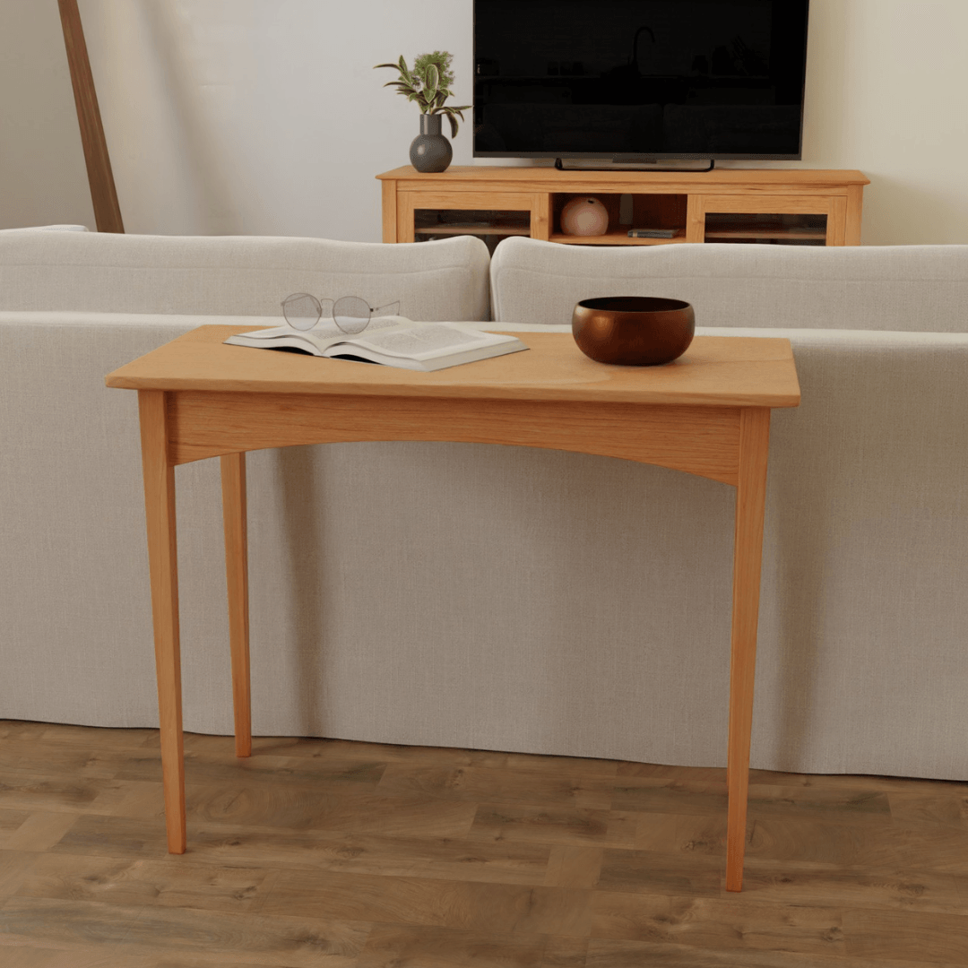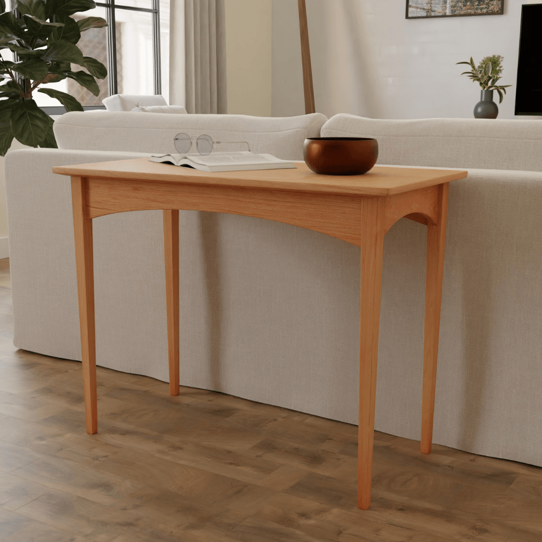 The Canterbury Sofa Table features arched aprons and slim legs for a timeless look. This handcrafted side table is available in Natural Cherry, Maple, or Walnut hardwood.