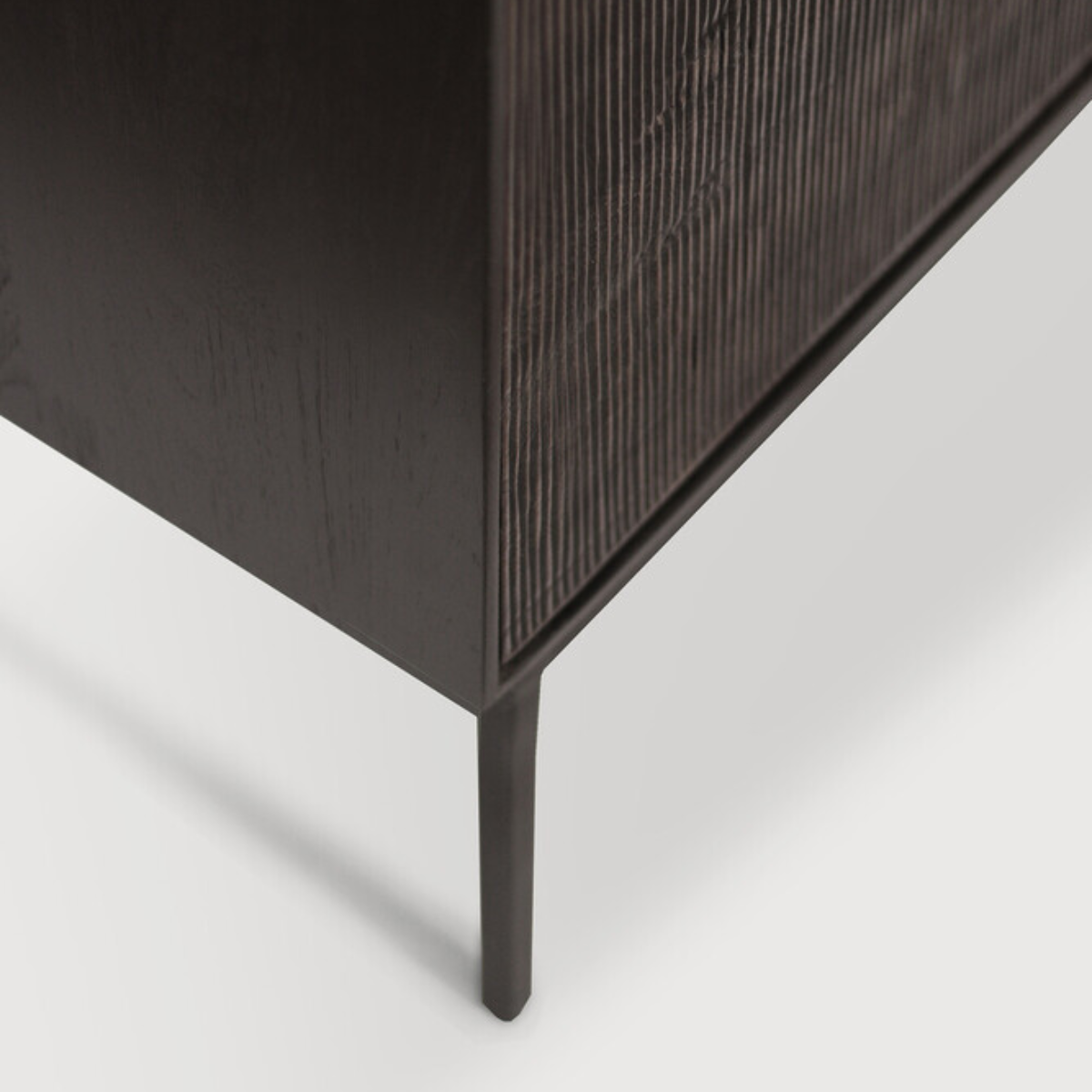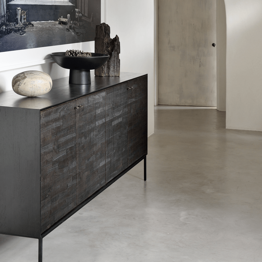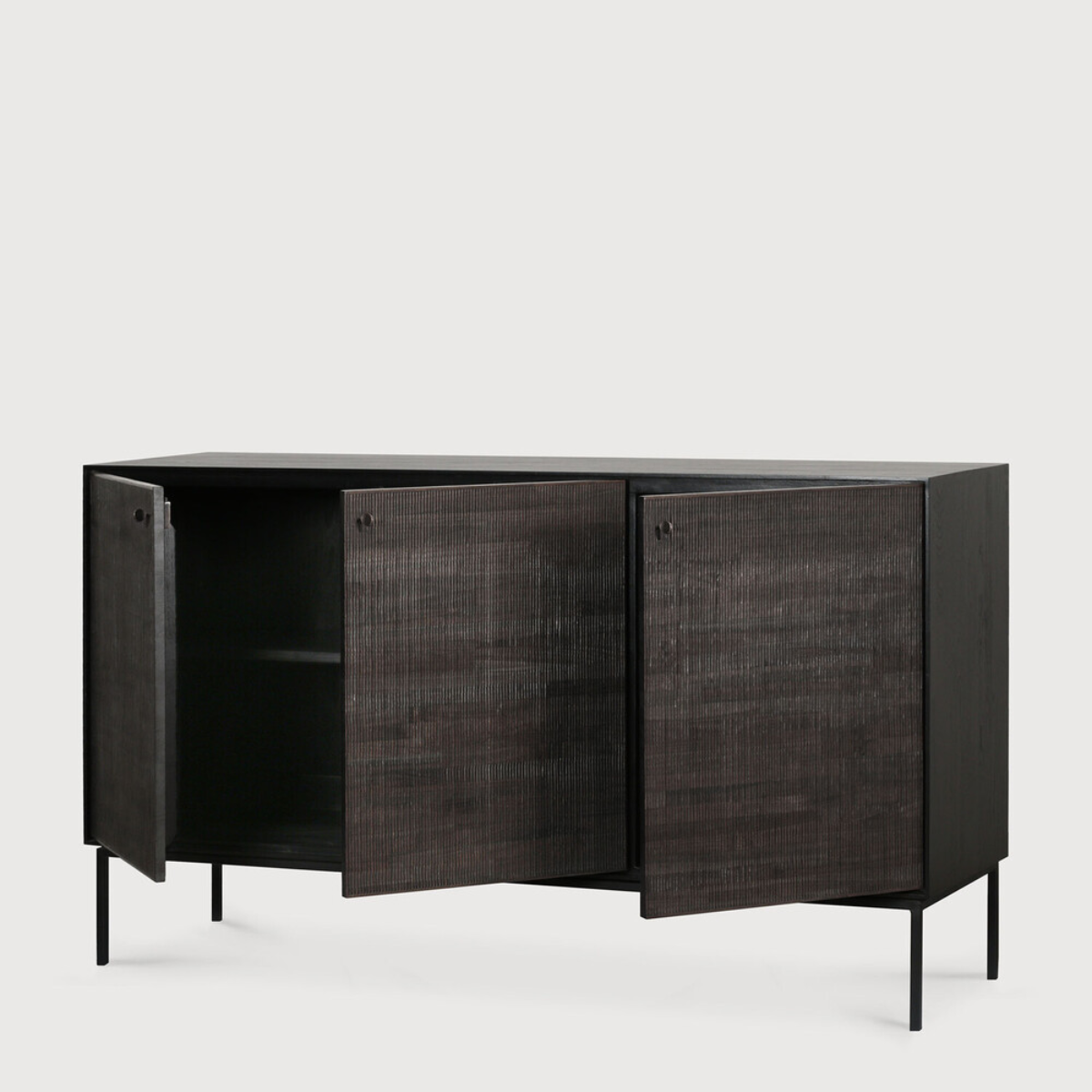 The Grooves sideboard is soulful to say the least. Every single line you see is hand carved, making each piece truly unique. Small imperfections are part of the story, even more so: they enhance Grooves' character. The result is a slightly different surface every time, each with its own rhythm and dynamics. The beautiful dark tinted teak continues on the inside, where shelves will hold your most cherished objects.