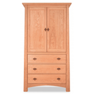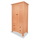 The Harvestmoon Armoire comes in two depths: a standard depth with adjustable shelving and a 4" deeper version that has both a closet pole and adjustable shelving. In either configuration, you can select a 2 drawer or a 3 drawer base. The Harvestmoon collection combines Asian and modern elements that give both a light and grounded appearance. All drawers feature full-extension, soft-close slides and Walnut drawer pulls. Available in Natural Cherry, Maple, or Walnut hardwood.