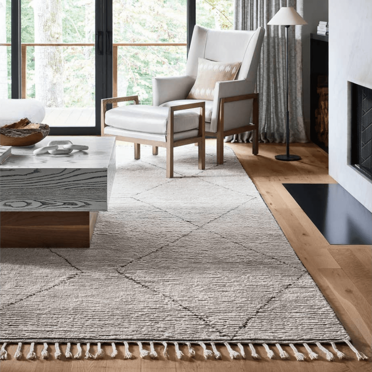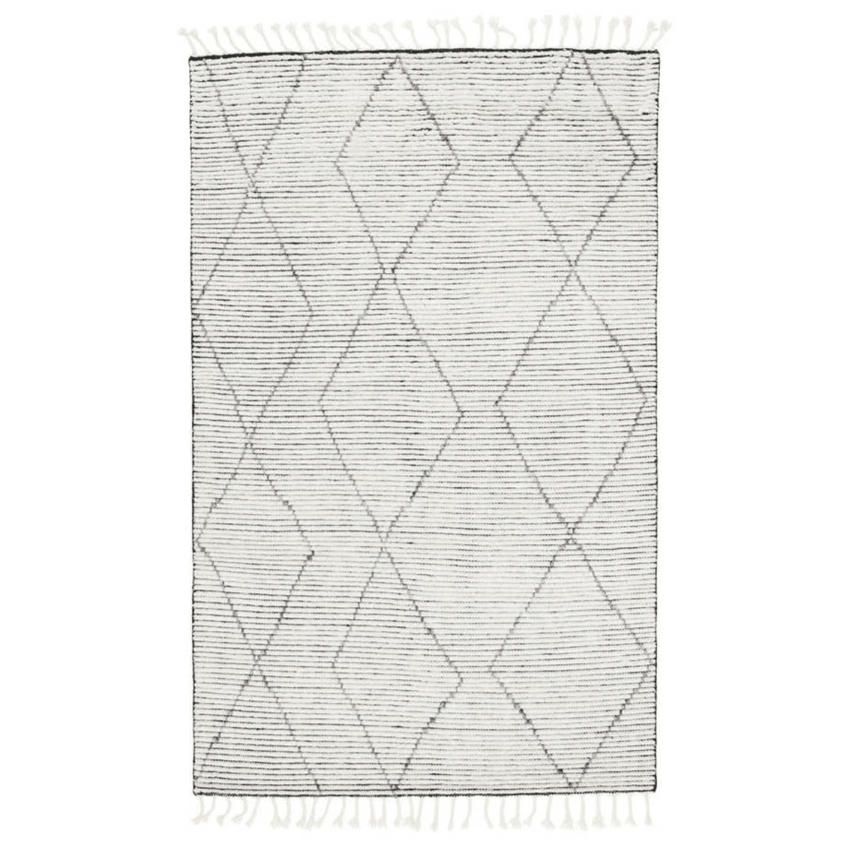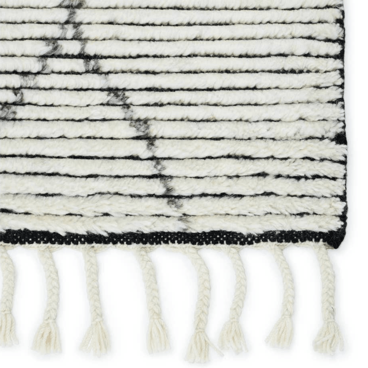 Inspired by textiles from the Tullu region in Morocco, the Alpine collection brings texture and versatility to both global and modern spaces. Crafted of natural wool, the hand-knotted Ammil rug features a plush, ridged feel and an asymmetrical trellis design in cream and black tones.