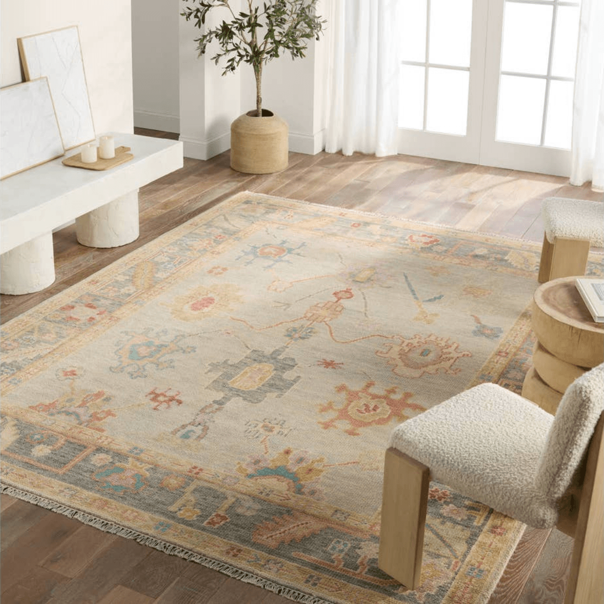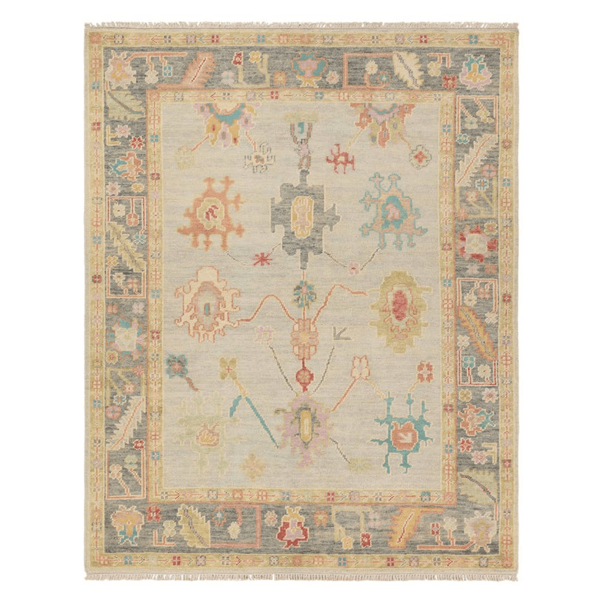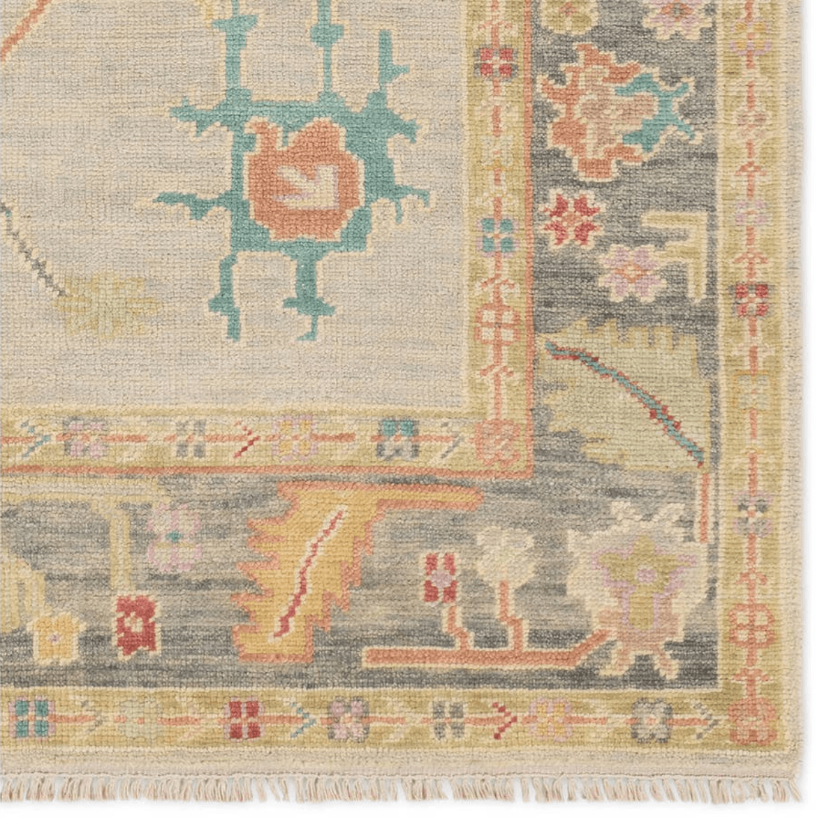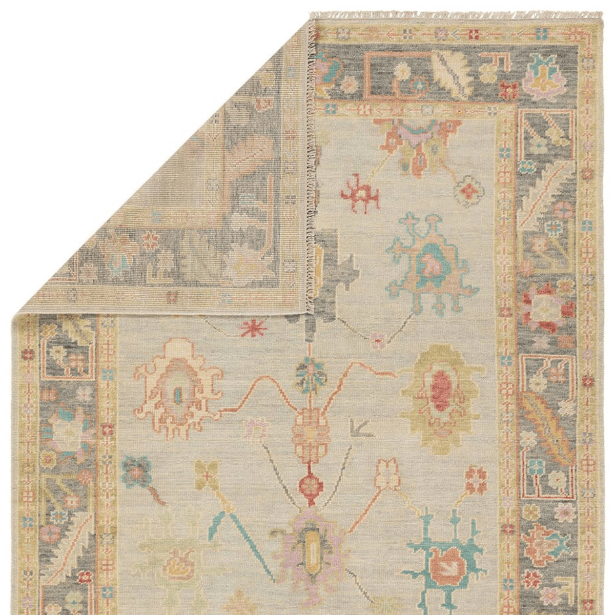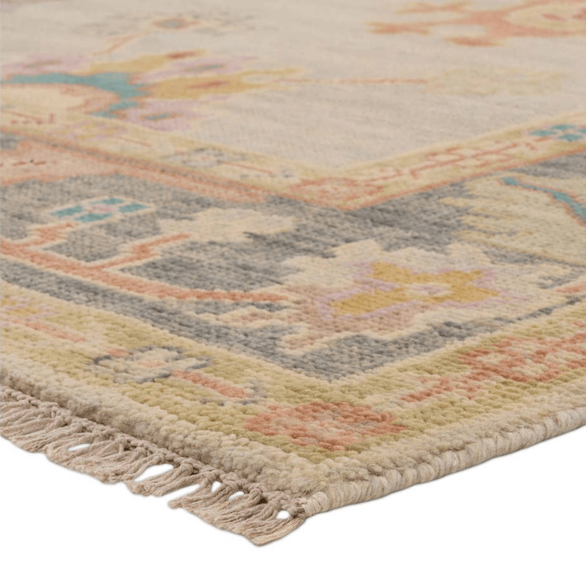 The updated traditional Everly collection features Oushak-inspired designs in tones soft pastel. The Olivia design features an intriguing colorway of tan, gray, blue, pink, red, cream, yellow, and orange. This hand-knotted wool rug anchors living spaces with a fresh take on vintage style. The low, easy-care pile delights in both high and low traffic areas of the home.