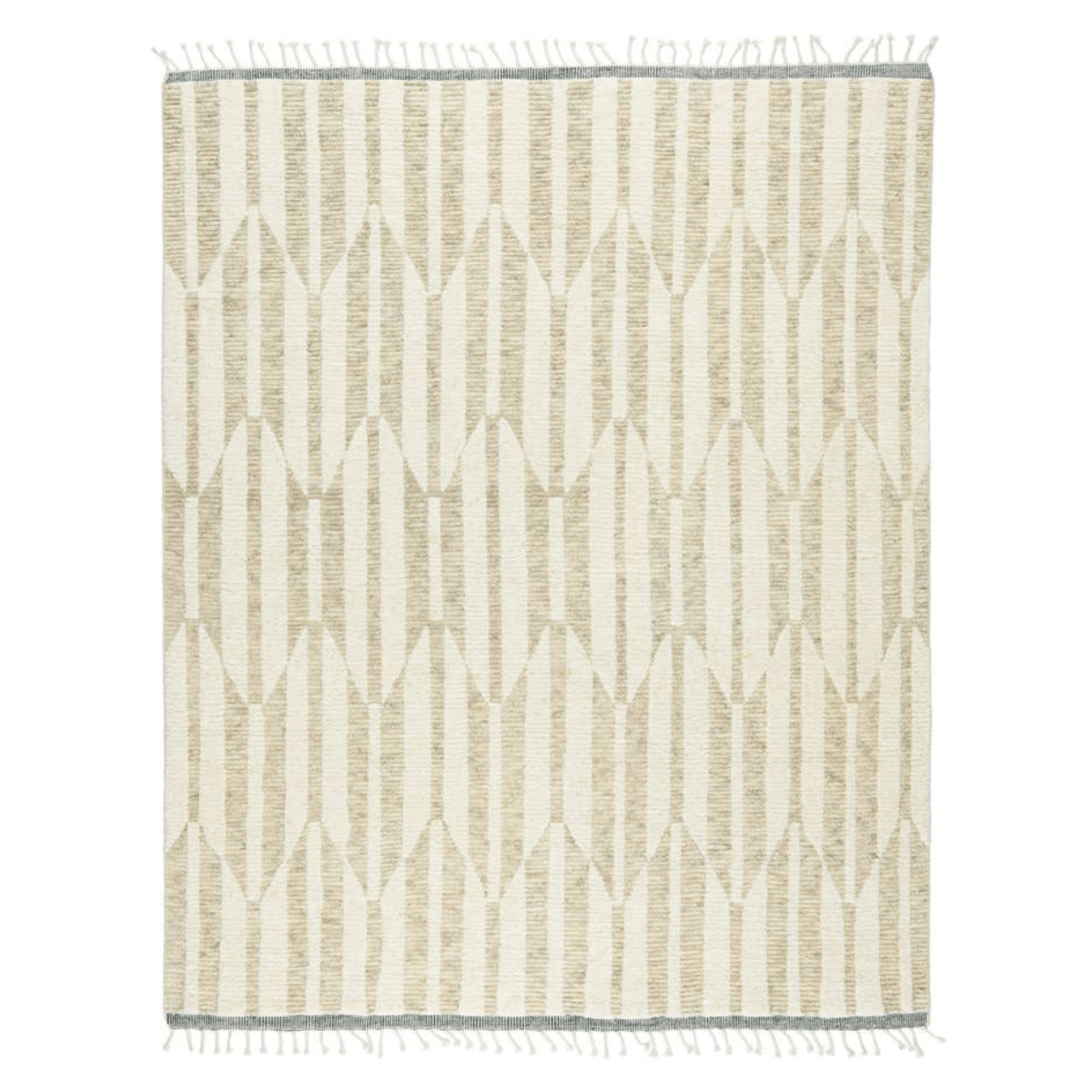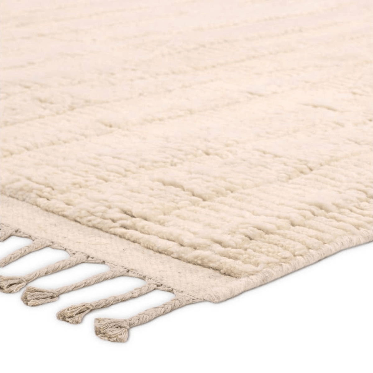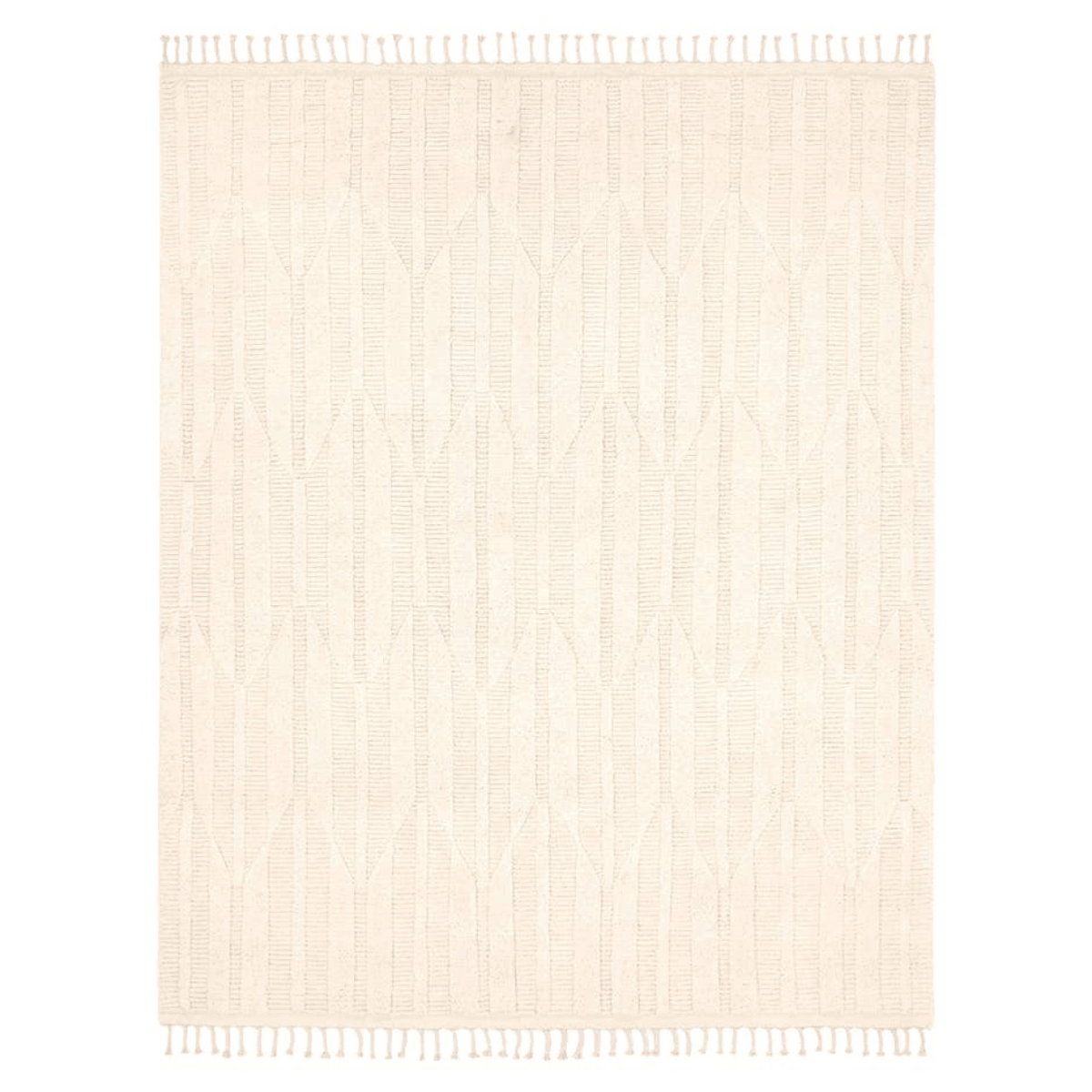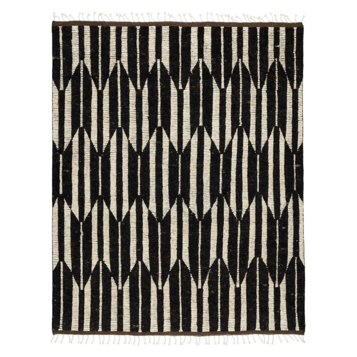 The Keoka collections boasts a fresh take on classic Afghani hand-knotted textiles. In easy-to-decorate colorways the Ela rug anchors the room with versatility and neutral appeal. The texture-rich wool pile features a ribbed construction that lends unique linear details to the dynamic trellis patterns. Braided fringe accents and a black, striped flatweave border add a dose of global flair.