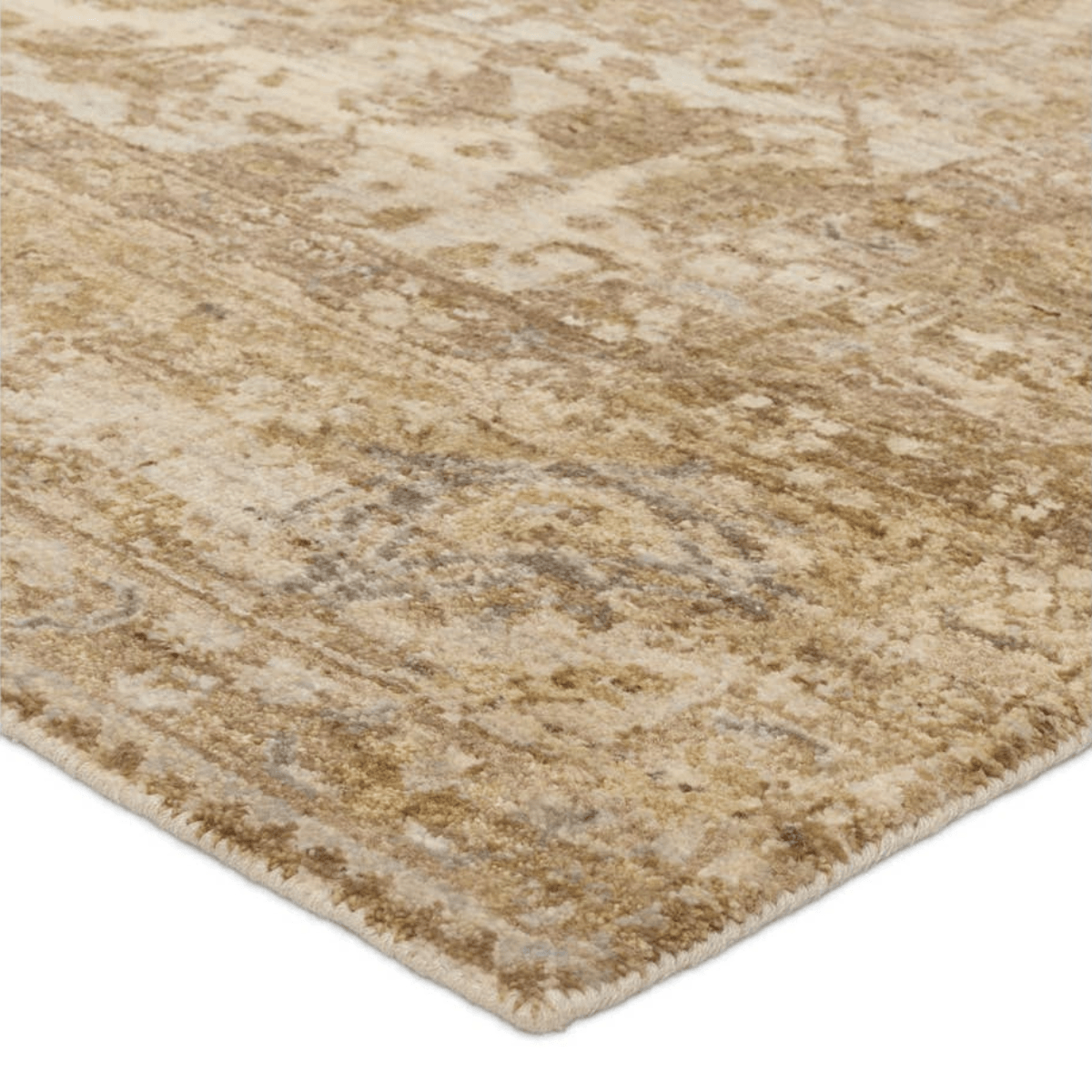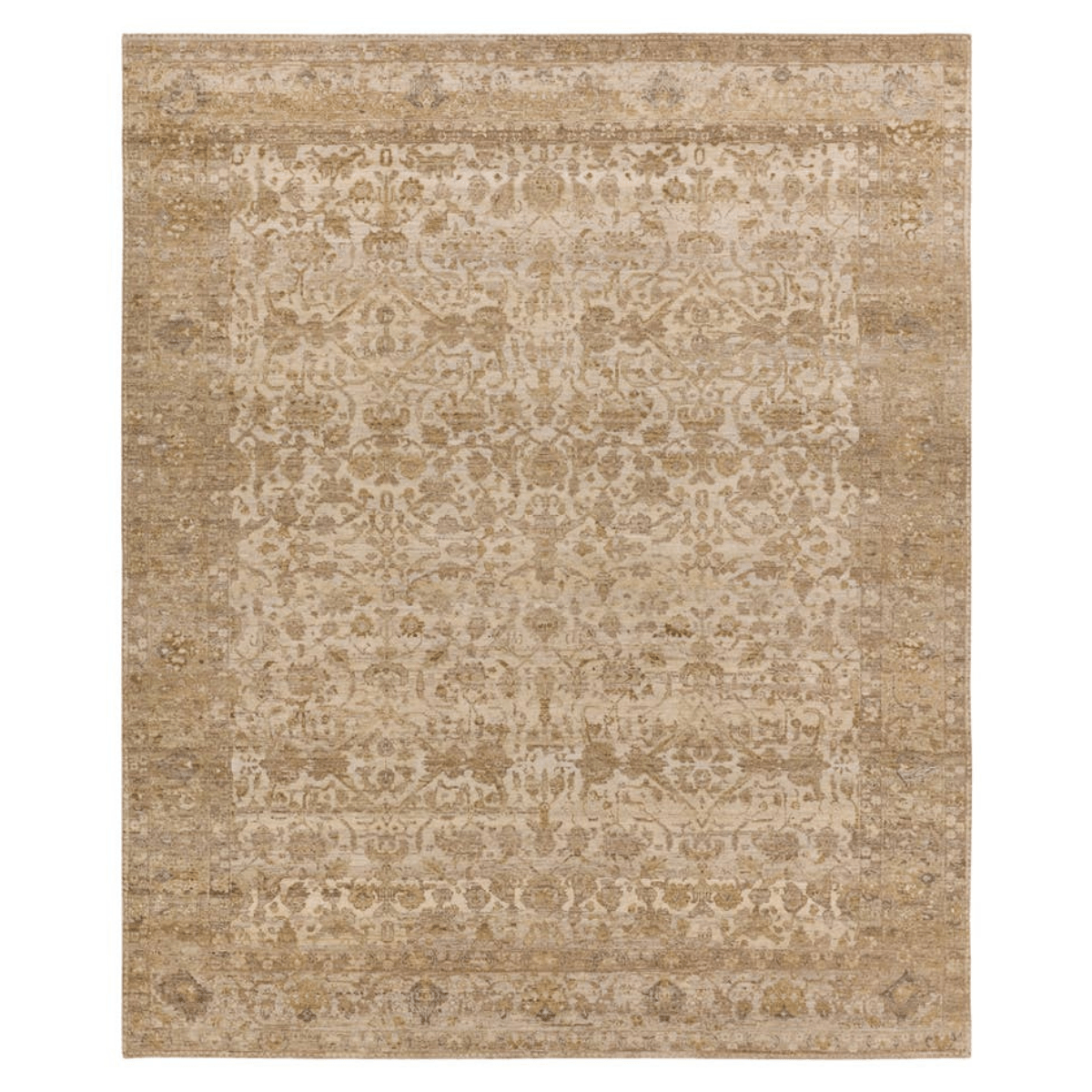 The handknotted Mihret collection gathers inspiration from traditional patterns that offer elegance and a refined, modern colorway. Expertly handcrafted in India with 64 knots per square inch for unparalleled quality, the Zeniba design features traditional floral and scrolling details and a thick border. The tan, gray, and cream colorway, and intentional distressing establishes an updated traditional style. Naturally stain-resistant, the 100% cut wool pile is easy to care for and withstands high traffic areas of the home, children, and pets. Obtaining both a Nest Seal and RugMark certification, this global area rug brings ethical, handmade luxury to the home.