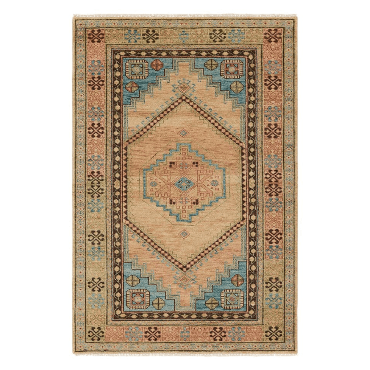 The eye-catching and boldly colored Reza collection features an assortment of Turkish-inspired designs that emulate the unique bazaar finds overseas. These handknotted designs boast a 100% wool construction for heirloom-quality durability. The Lunja rug features a medallion and intricate border in hues of vivid blue, tan, red, sage, beige, and brown. The low pile creates an easy-to-clean accent piece that thrives in both high and low traffic areas of the home.