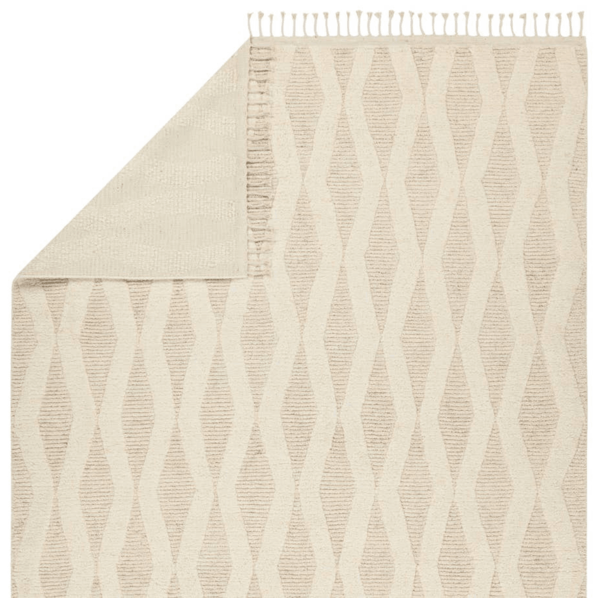 The Keoka collections boasts a fresh take on classic Afghani hand-knotted textiles. In easy-to-decorate tones of cream, the light and airy colorway of the Ela rug anchors room with versatility and neutral appeal. The texture-rich wool pile features a ribbed construction that lends unique linear details to the dynamic trellis patterns. Braided fringe accents and a black, striped flatweave border add a dose of global flair.