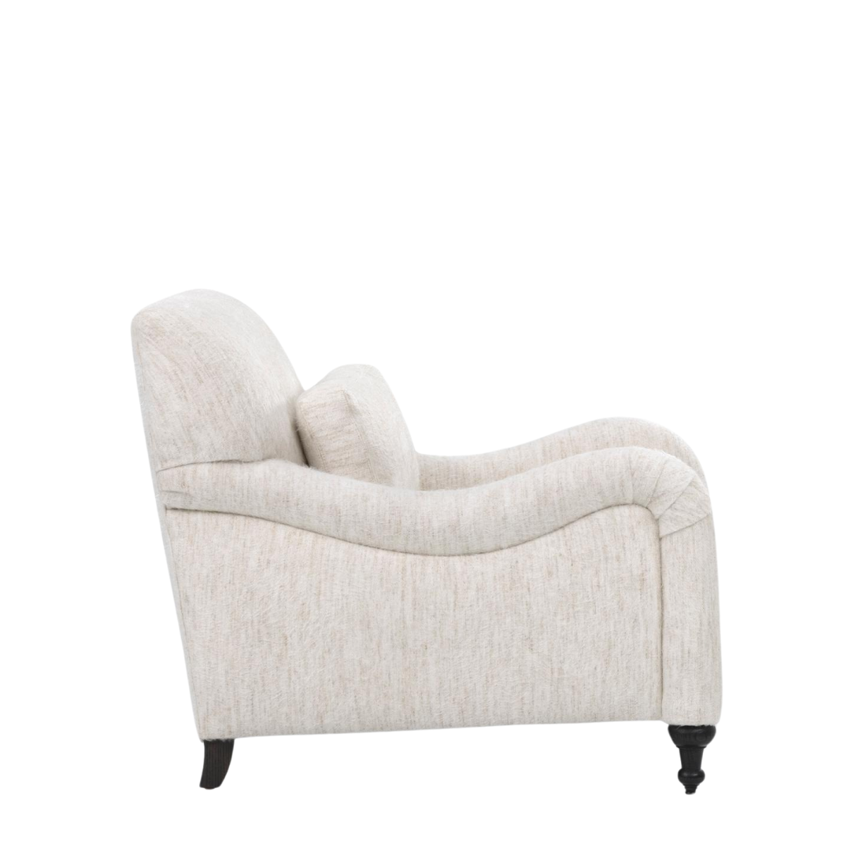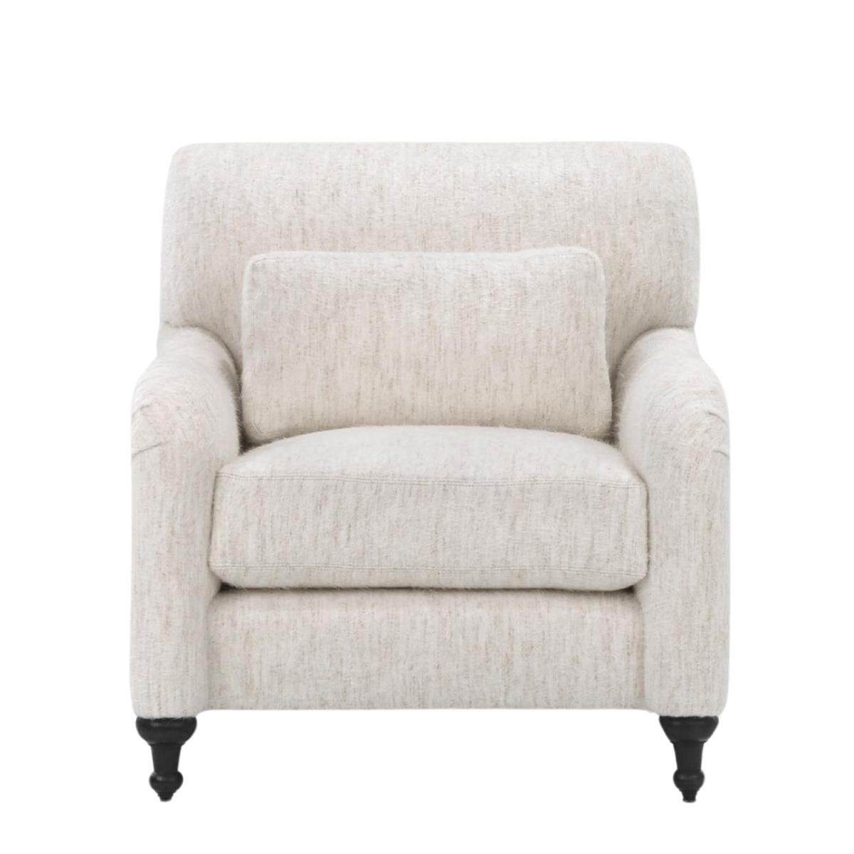 The Margot Club Chair features a refined silhouette with soft, rounded arms, a tight back, and a loose seat cushion for a perfect blend of elegance and comfort. Complemented by a supportive lumbar pillow and detailed, turned front legs, this chair offers a timeless look with added coziness.