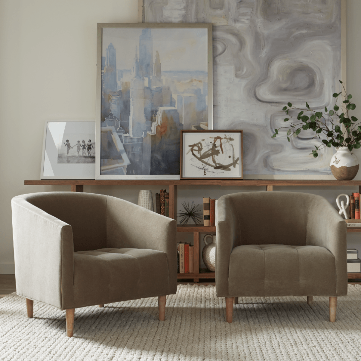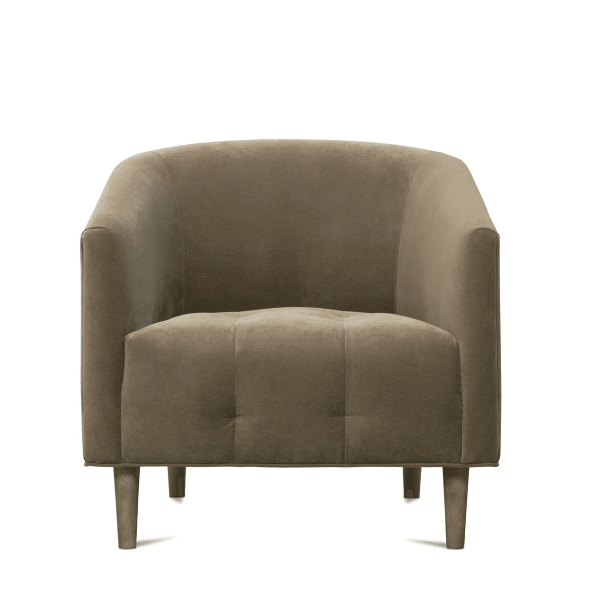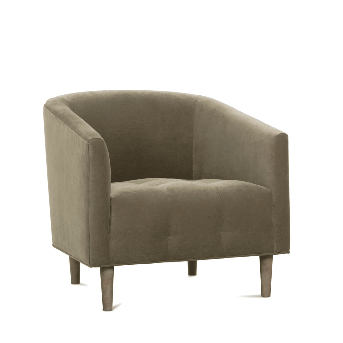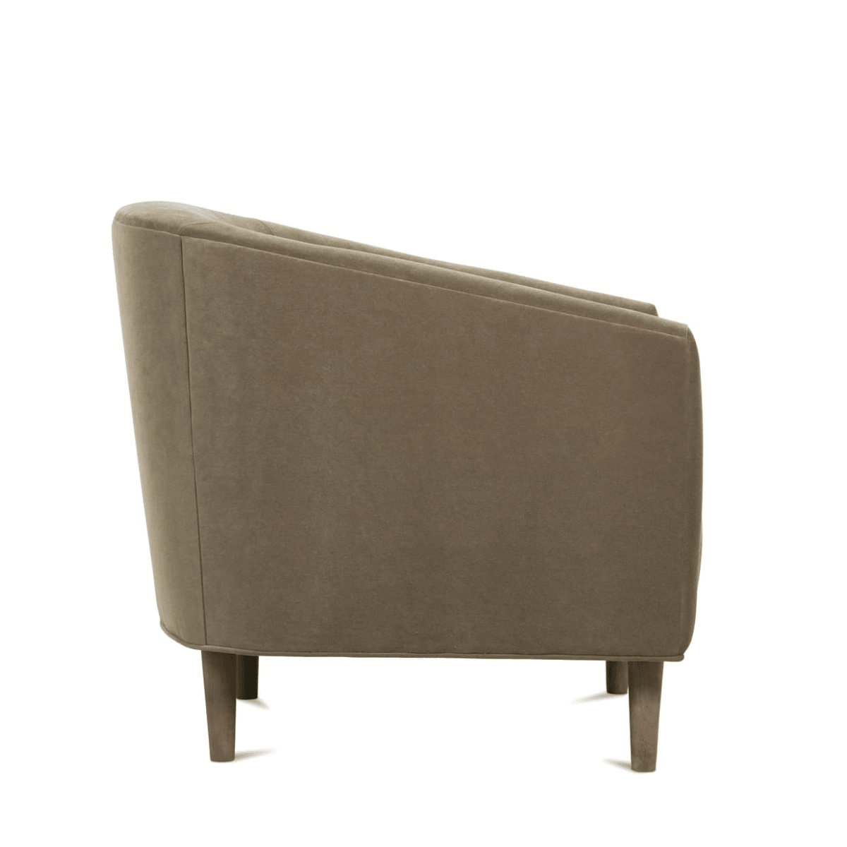 A modern take on the classic barrel shape, the Pate Chair features chic wooden legs and a gently curved back.