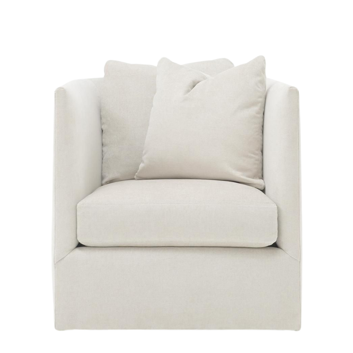 The Tatum Swivel Club Chair features a distinctive silhouette with angled out arms, a sloped back, and loose seat and back cushions.