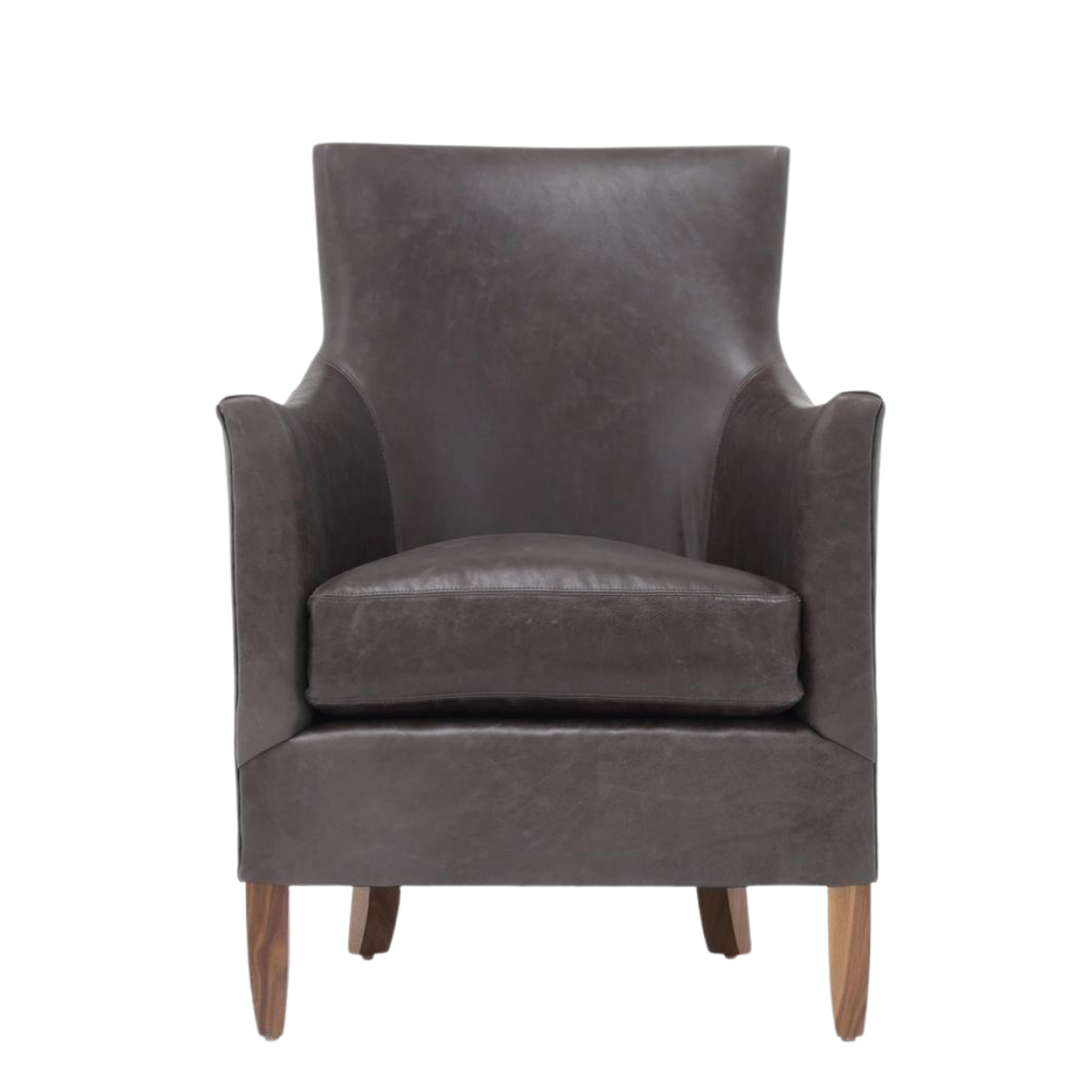 The Victor Club Chair features elegantly curved arms, a supportive high back, and a plush, loose seat cushion, all supported by beautifully crafted exposed wooden legs.