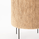 - Jute yarn shade; blackened iron frame; brass plate diffuser; fabric covered cord