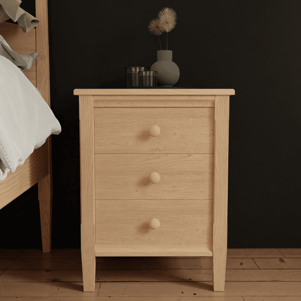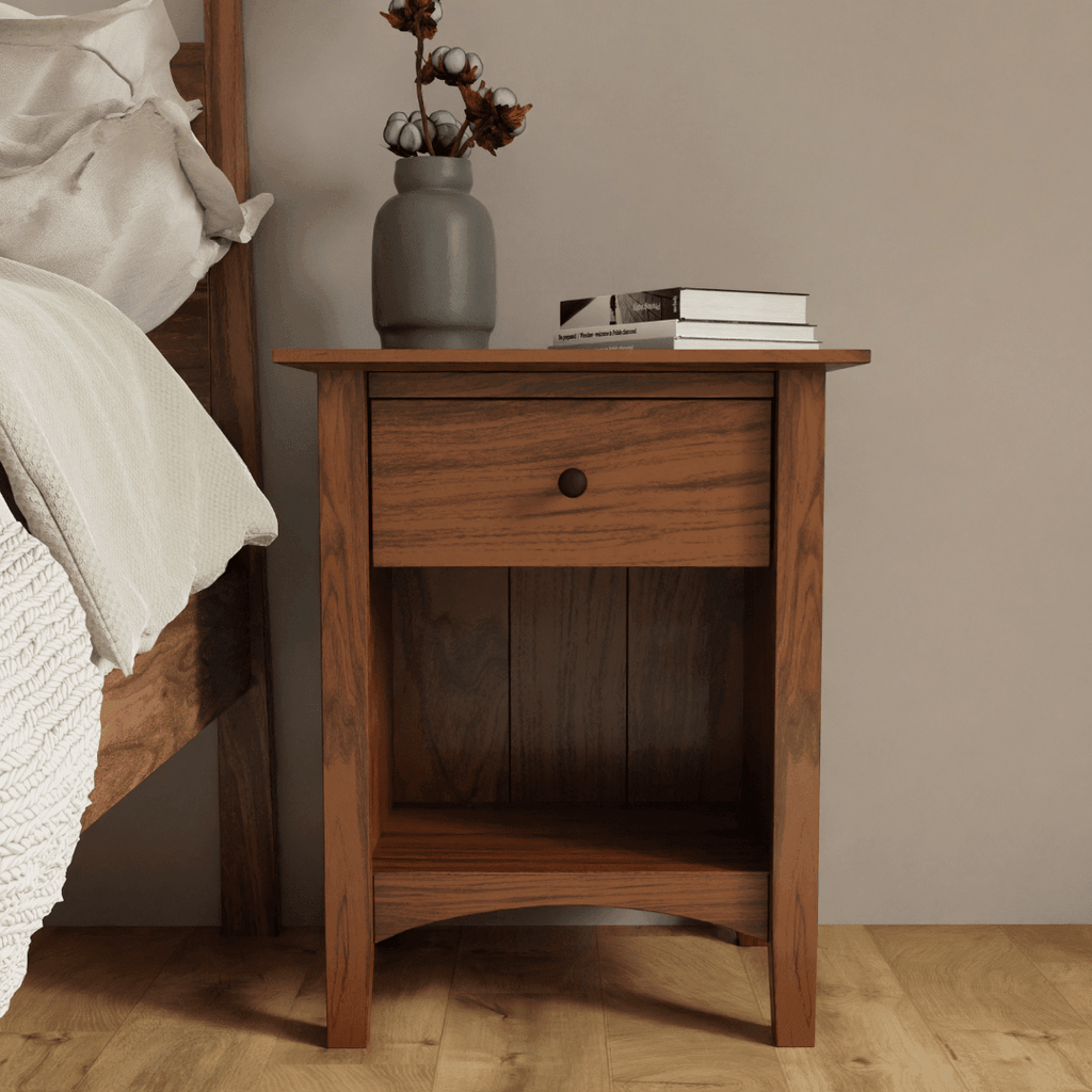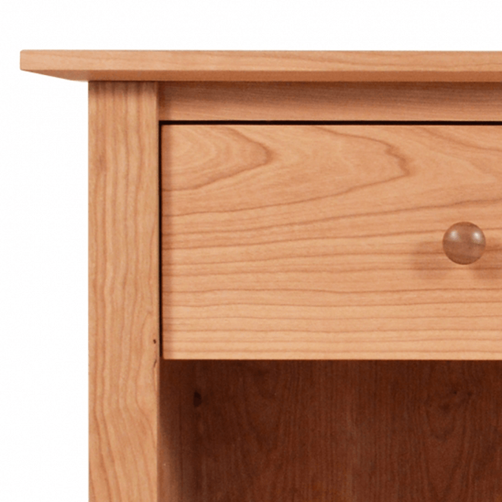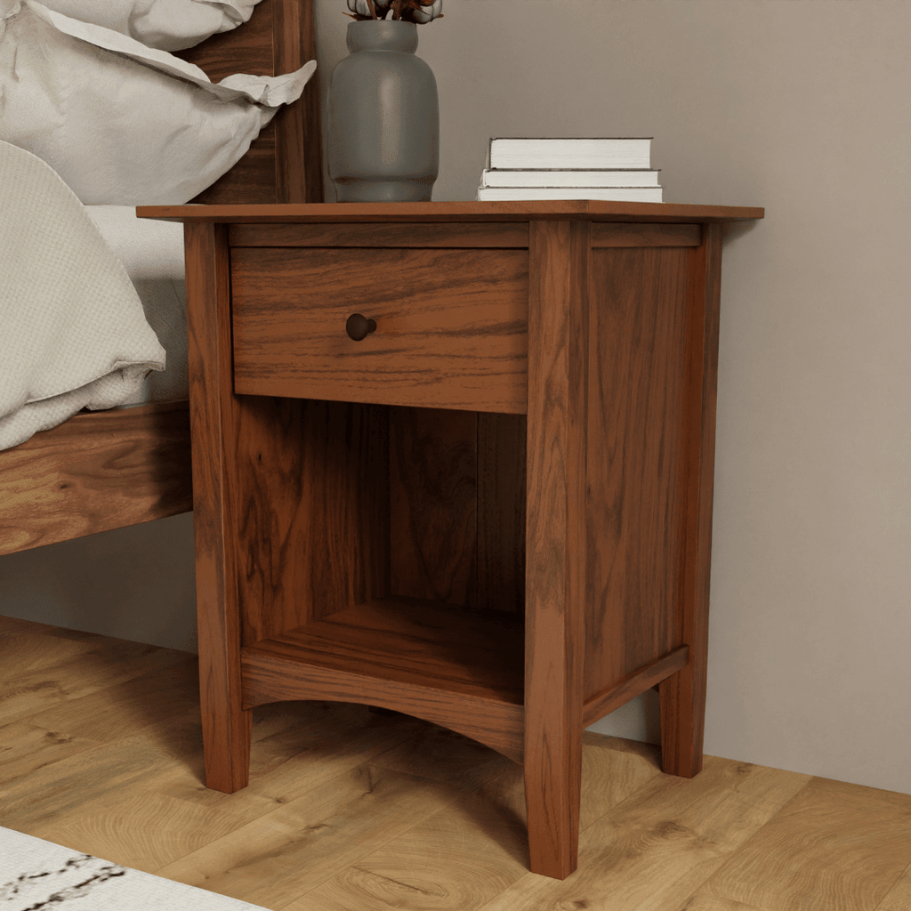 The Canterbury One Drawer Nightstand features a curved base with slightly angled legs and is available in Natural Cherry, Maple, or Walnut hardwood. Choose between an open shelf or a storage door underneath the soft-close drawer.