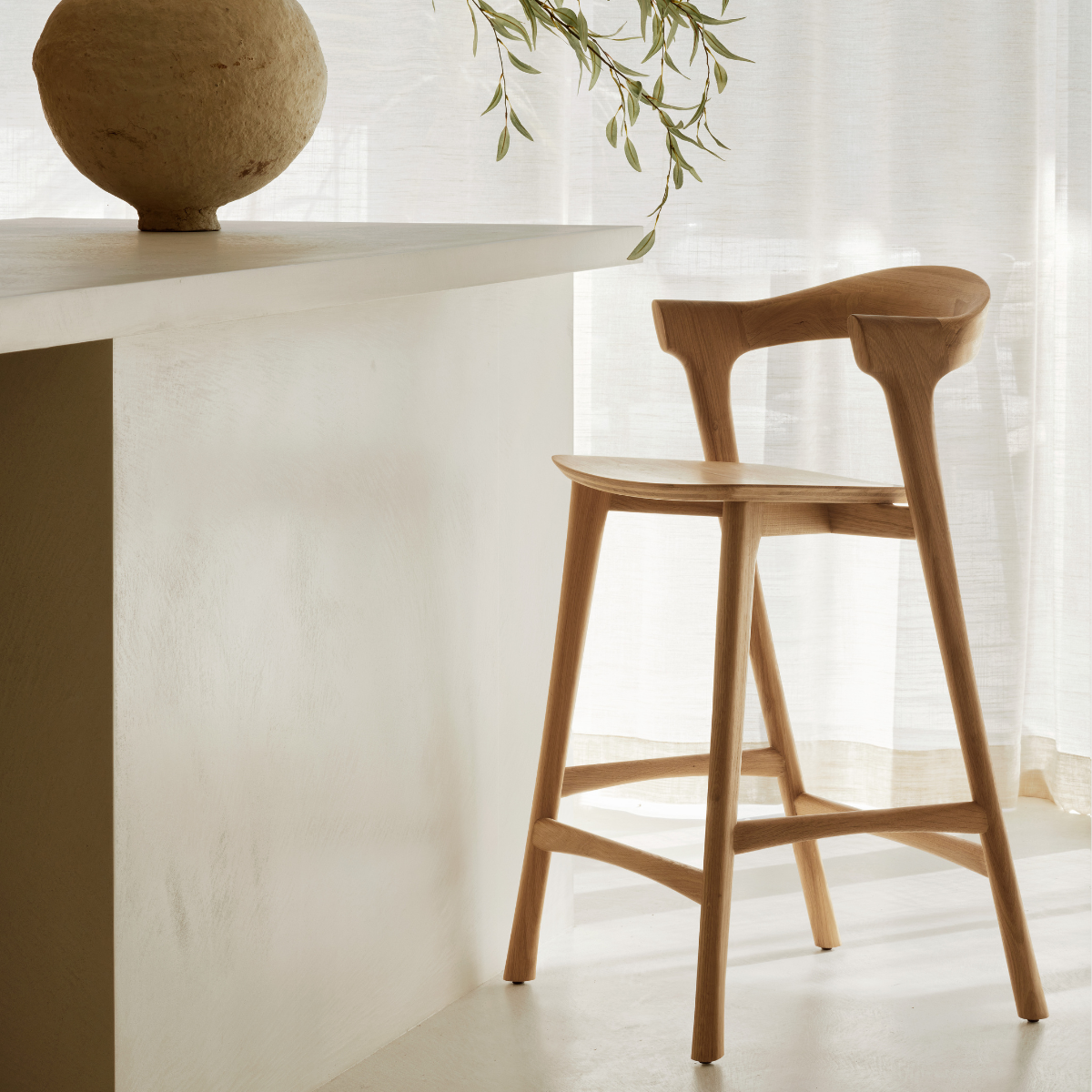 Reminiscent of a goat's curved horns, the Bok collection combines sculptural elegance and contemporary crafting into a graceful and airy form. Over the years, the Bok dining chair has become one of Ethnicraft's most recognizable designs — and the Bok stool, a clever adaptation that echoes its distinctive silhouette.
