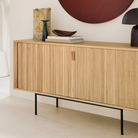 The Roller Max sideboard offers functional storage in an eye-catching design. Featuring sliding doors, adjustable shelving and seamlessly integrated handles, this piece beautifully showcases the collection's stacked wood-stick design. The result is an elegant and sophisticated item for both residential and commercial spaces. Designed by Alain van Havre.