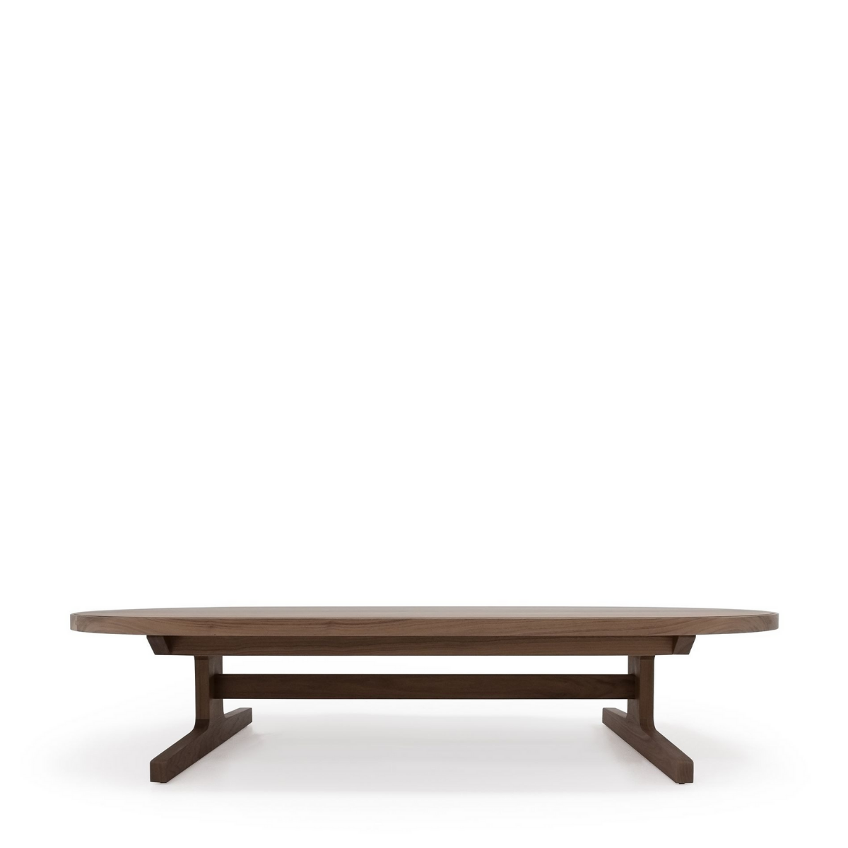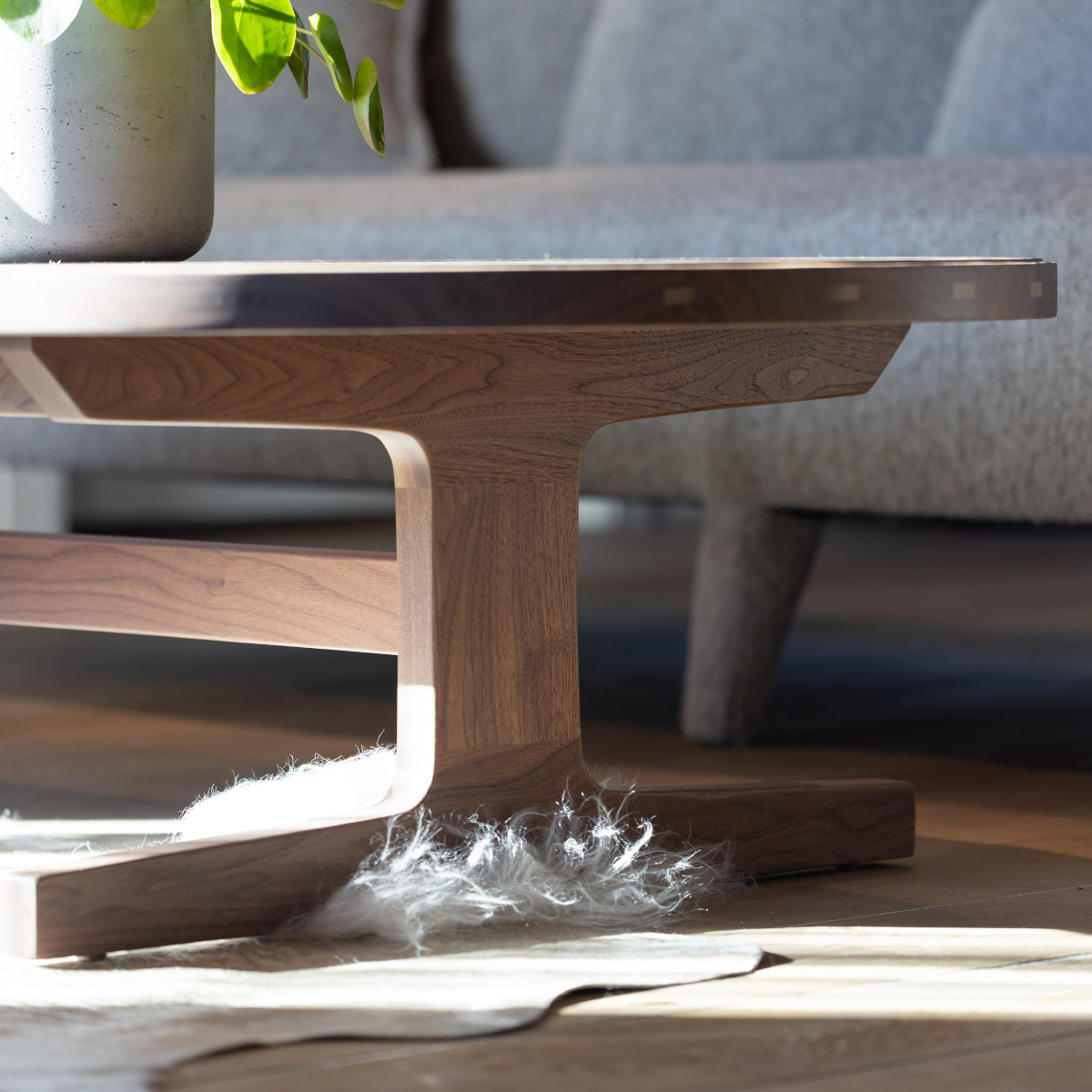 Verellen's I Beam Coffee Table is a take on the classic trestle table. It's handmade from sustainably harvested hardwood featuring an oval table top with unique step detail and trestle style legs.