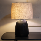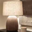 A charming blend of form and function, featuring a beautifully rounded wooden base and a sleek fabric shade.