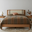 Inspired by the London neighborhood of Nottinghill, this collection was created to evoke a welcoming and snug atmosphere. Beautiful red and mustard stripes are featured on a rich brown background in this luxurious herringbone fabric. The duvet cover and pillow shams boast a striped pattern on one side and a solid brown on the other, providing a versatile and stylish addition to any bedroom.
