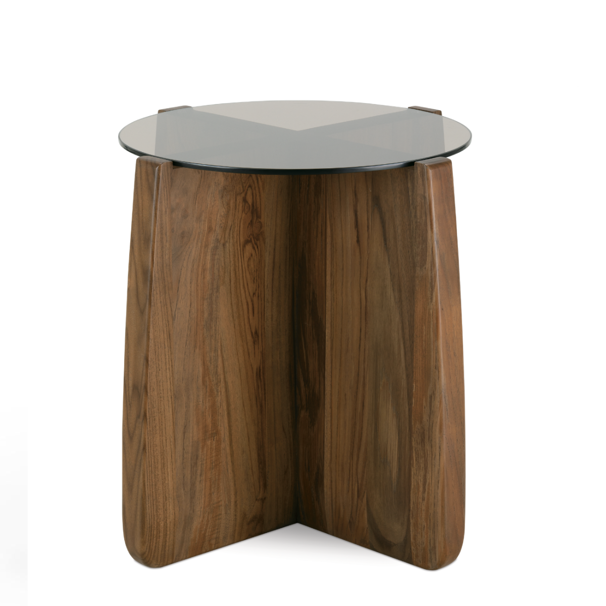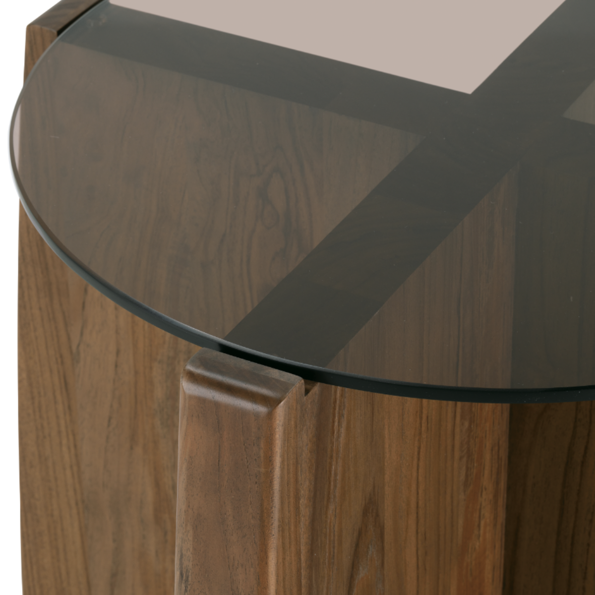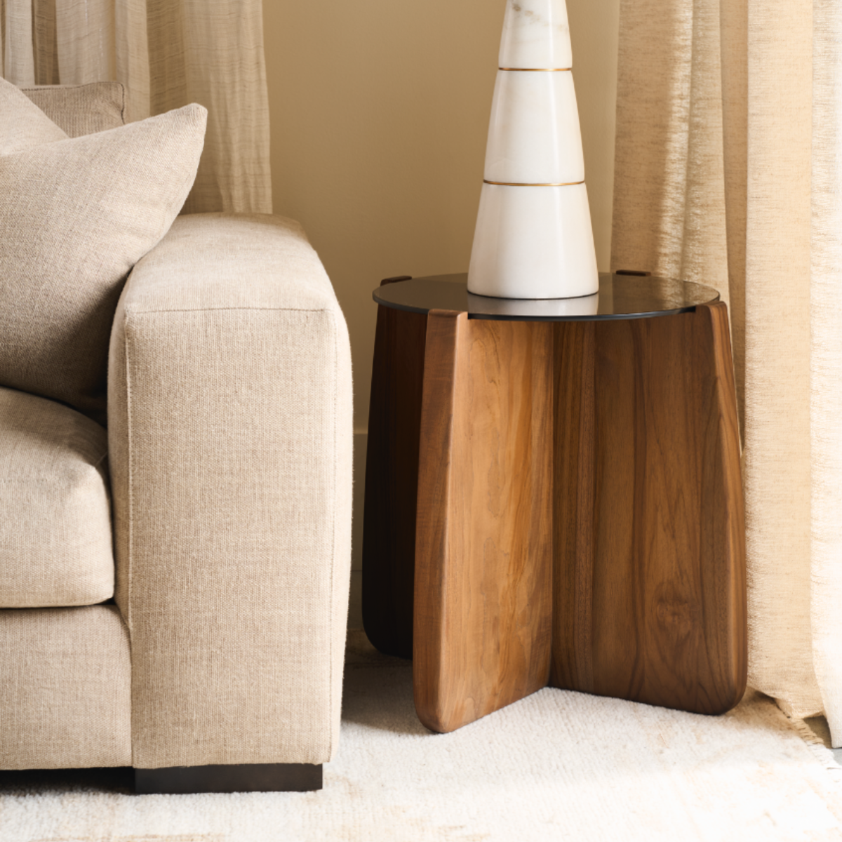 The Nova Round End Table exemplifies the artful fusion of organic warmth and contemporary sophistication. Crafted from sustainably sourced solid teak with a light, natural finish, this sculptural piece features elegantly curved panels that create a striking architectural base, while its sleek smoked glass top adds an airy, modern touch. The table's thoughtful proportions and honest construction showcase Rowe's commitment to exceptional craftsmanship, with each panel meticulously shaped to achieve both visual balance and structural integrity. Whether paired with plush upholstered seating or standing alone as an artistic accent piece, this versatile end table brings a sense of refined simplicity to any living space, while its timeless design ensures it will remain a cherished element of your home's story for years to come.