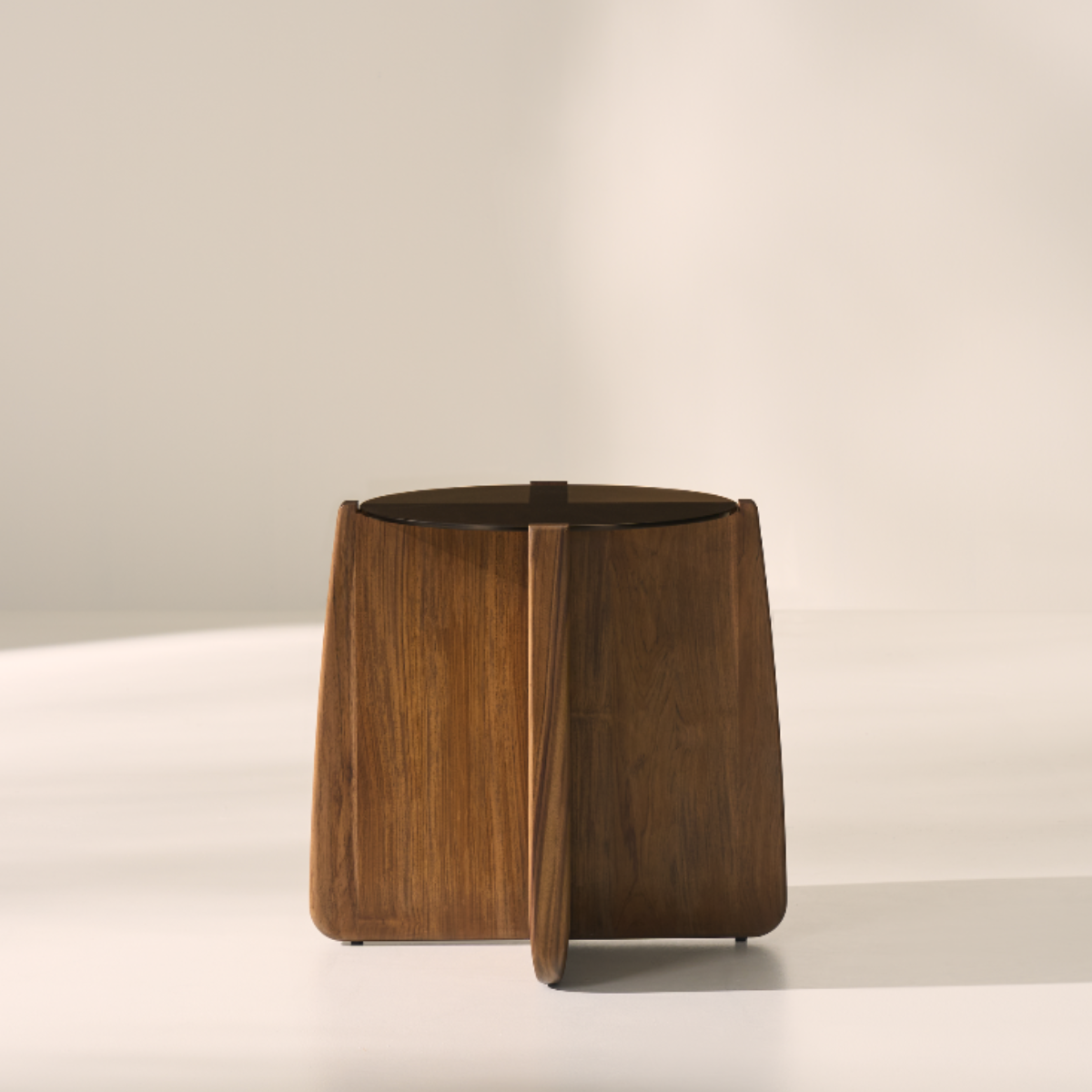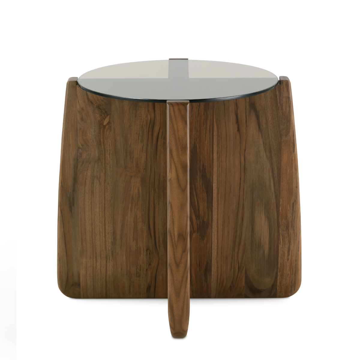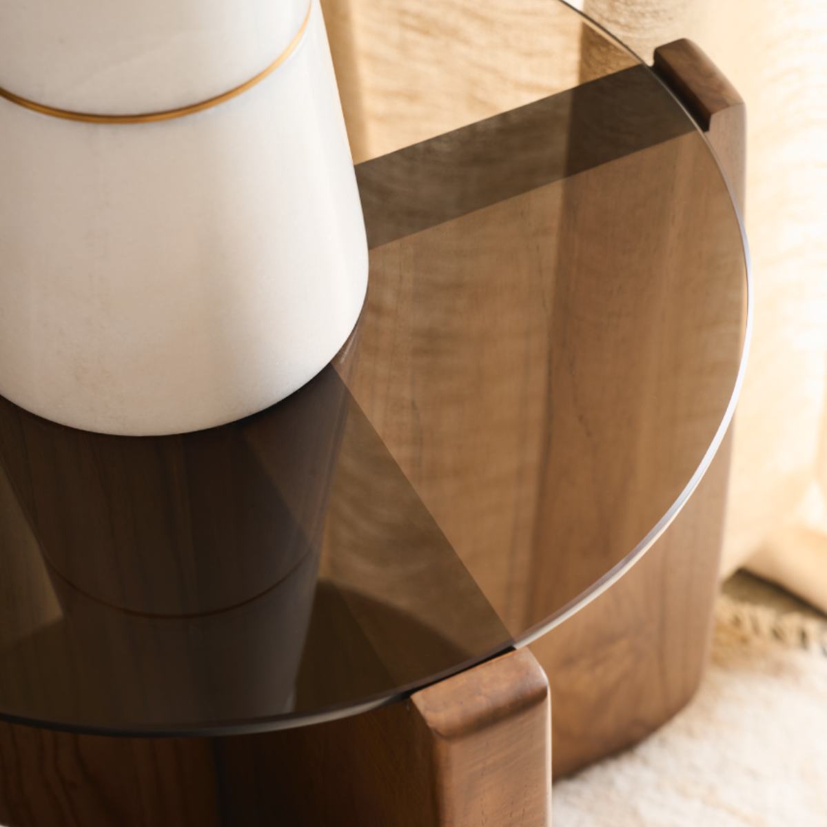 The Nova Round End Table exemplifies the artful fusion of organic warmth and contemporary sophistication. Crafted from sustainably sourced solid teak with a light, natural finish, this sculptural piece features elegantly curved panels that create a striking architectural base, while its sleek smoked glass top adds an airy, modern touch. The table's thoughtful proportions and honest construction showcase Rowe's commitment to exceptional craftsmanship, with each panel meticulously shaped to achieve both visual balance and structural integrity. Whether paired with plush upholstered seating or standing alone as an artistic accent piece, this versatile end table brings a sense of refined simplicity to any living space, while its timeless design ensures it will remain a cherished element of your home's story for years to come.