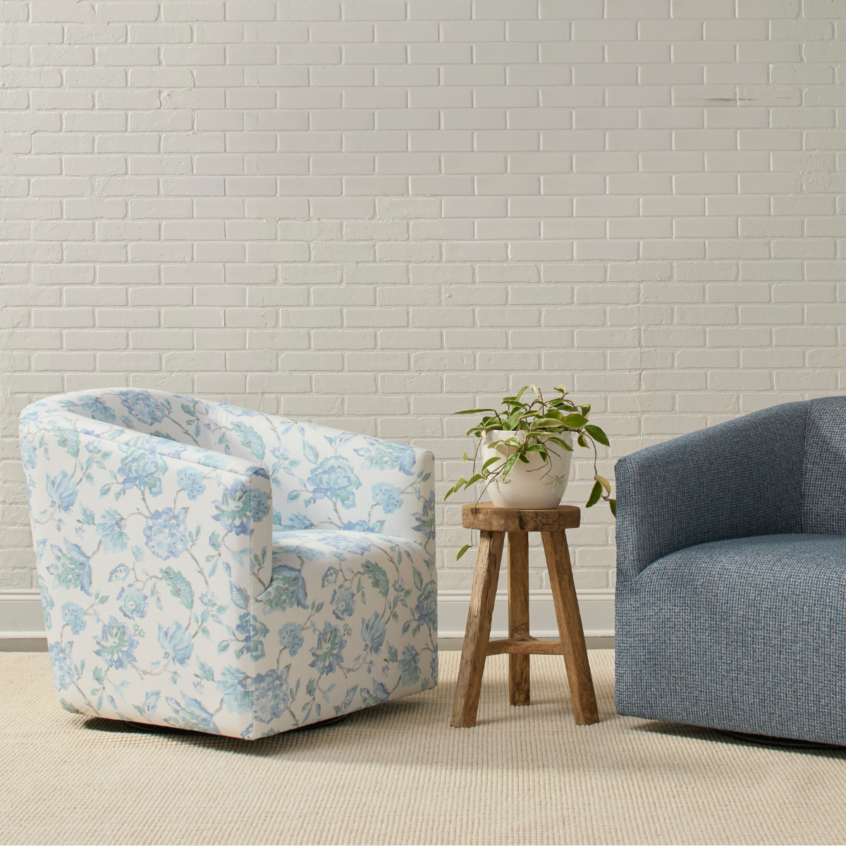 Daintier than the Ollie, the Rue swivel chair is a plush, feminine style. The curve of the rolled back hugs all who sit in it, while the swivel offers a 360 degree view of the room. This is a design that wants to be in on the action.