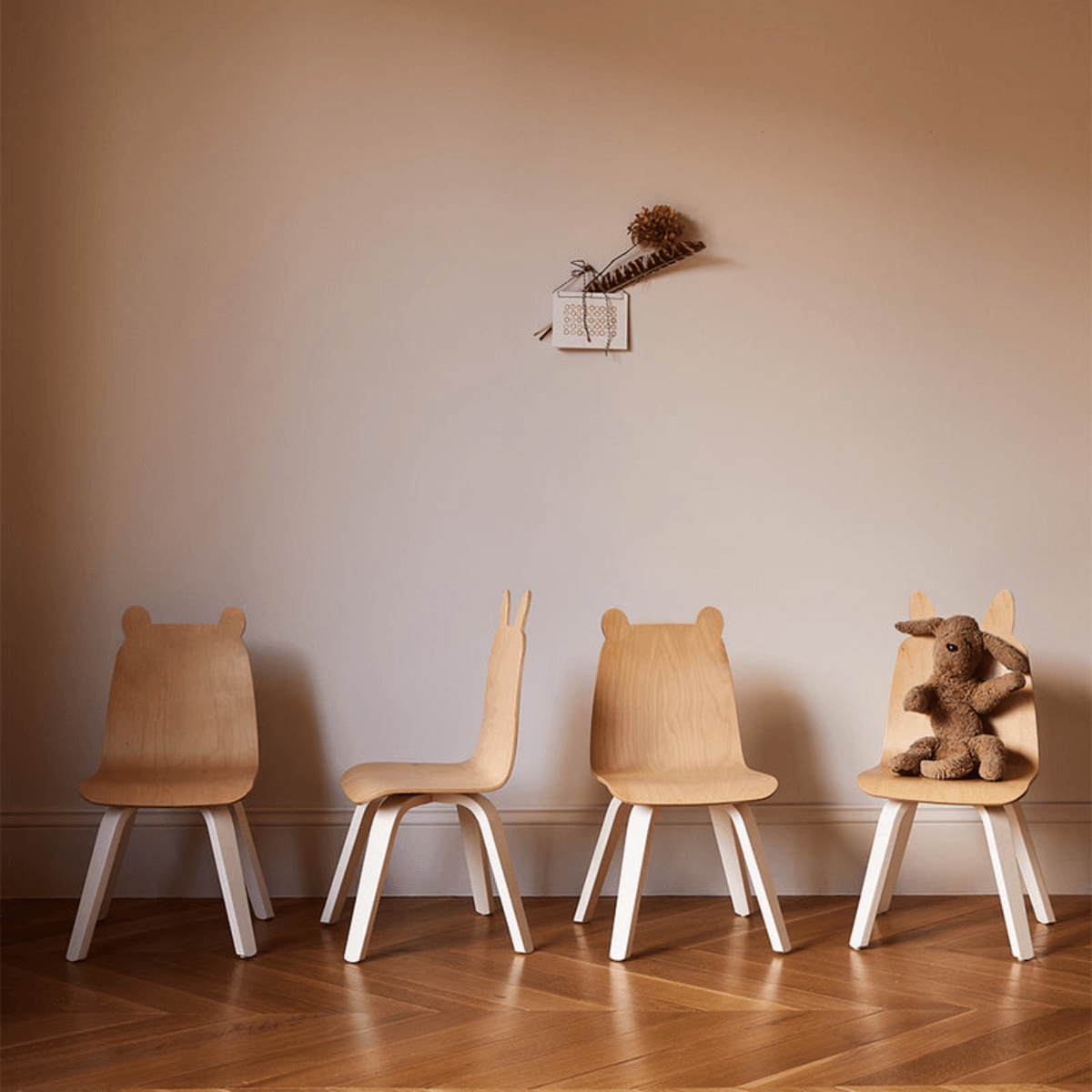 These adorable bear-eared bent plywood chairs are sold in sets of two. Fitting perfectly with the Oeuf play table, they are sure to inspire a bit of extra fun while your child creates, snacks, or reads in their very own, kid-sized chair