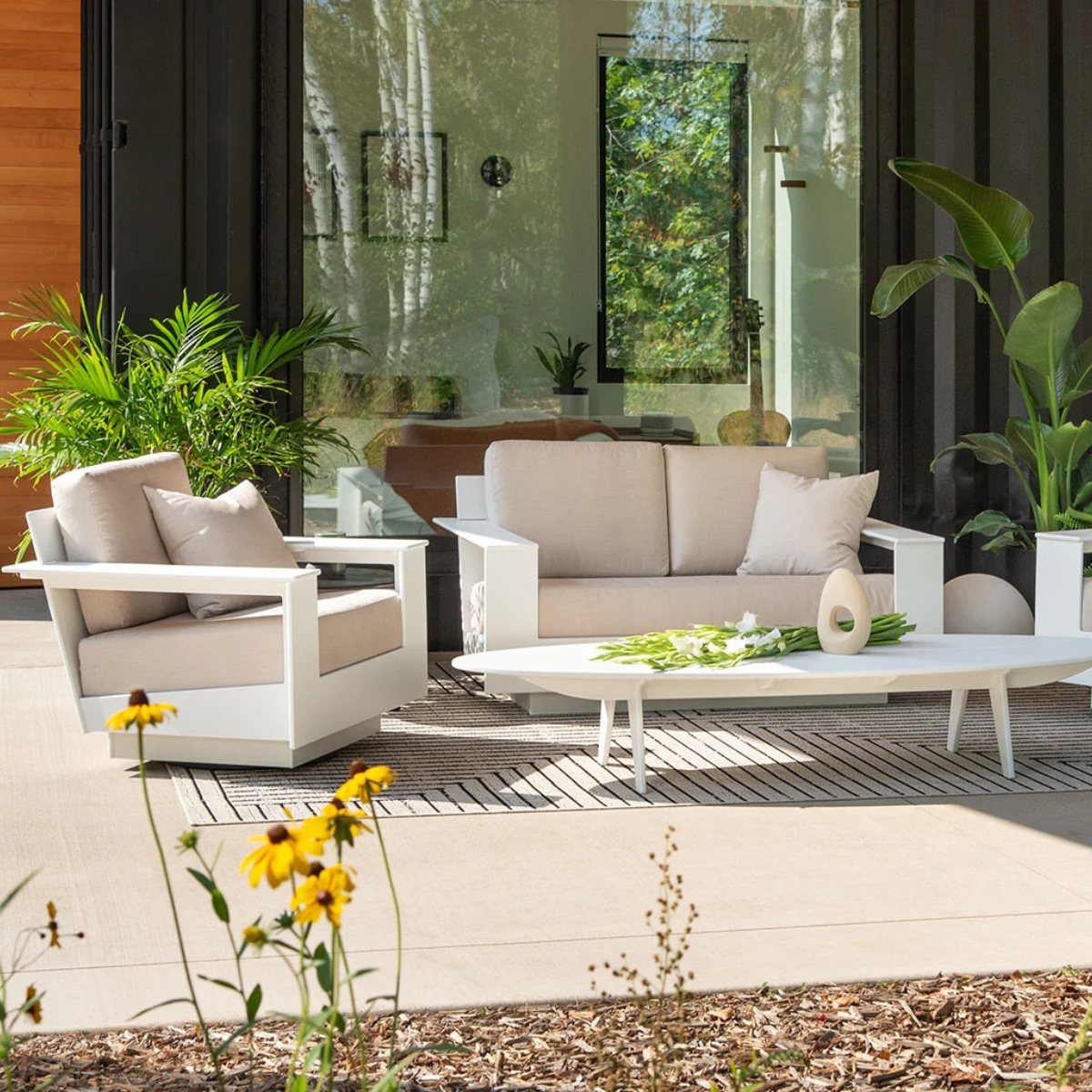 Maximize your outdoor living spaces with sustainably-made patio and dining furniture that’s expertly built to withstand any weather. Our selection of outdoor tables, chairs, sofas, and sectionals from Ethnicraft, Mater and Loll Designs are crafted to offer quality comfort and style, with minimal maintenance, or environmental impact. Ethnicraft’s solid wood dining and lounge furniture is made with FSC-certified hardwood sourced from responsibly-managed forests; it brings a natural elegance that complements nature seamlessly. Mater’s patented technology upcycles discarded plastic waste into stunning, modern pieces that can be disassembled for future recycling, and Loll Designs uses recycled plastics to create vibrant pieces that are maintenance-free so you’ll want to spend even more time outside! Add an extra touch of beauty to any seasonal patio, backyard, deck, or porch when you incorporate furniture and accent pieces that are not only functional and durable, but stylish as well.