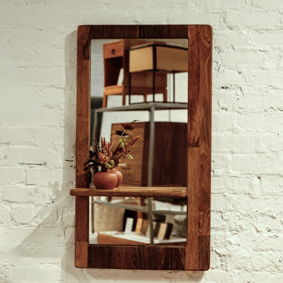 The Bello Mini Mirror is the perfect addition to any space. Place it by your doors to ensure you look great before leaving the house, and take advantage of the convenient shelf for storing those little things we often forget. Handcrafted in North Carolina and designed with reclaimed wine-infused oak, this mini mirror is functional and adds a unique touch to any room. Add a one-of-a-kind piece to your collection.